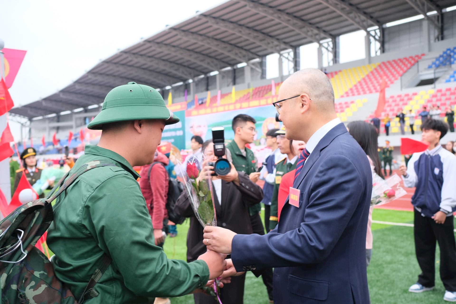 Ngay từ sáng sớm, không khí tại sân vận động đã rộn rã, tưng bừng, người thân, bạn bè và đông đảo nhân dân có mặt từ sớm để tiễn các tân binh trúng tuyển nghĩa vụ quân sự năm 2026 lên đường thực hiện nghĩa vụ công dân thiêng liêng.