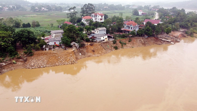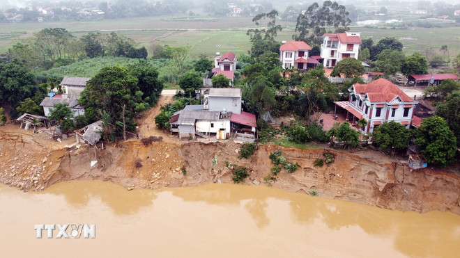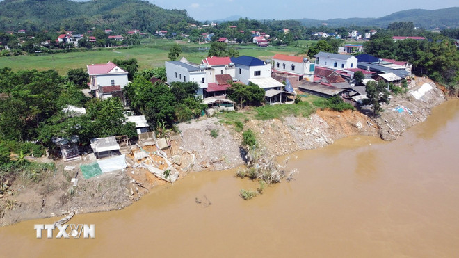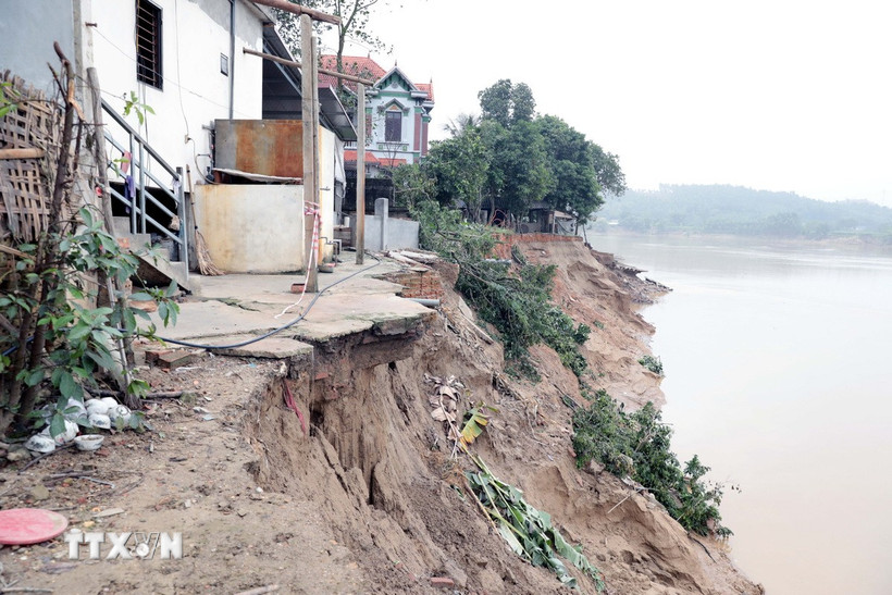 Sạt lở nghiêm trọng bờ sông Lô tại khu 20, xã Dân Chủ, tỉnh Phú Thọ. (Ảnh: Tạ Toàn/TTXVN)
