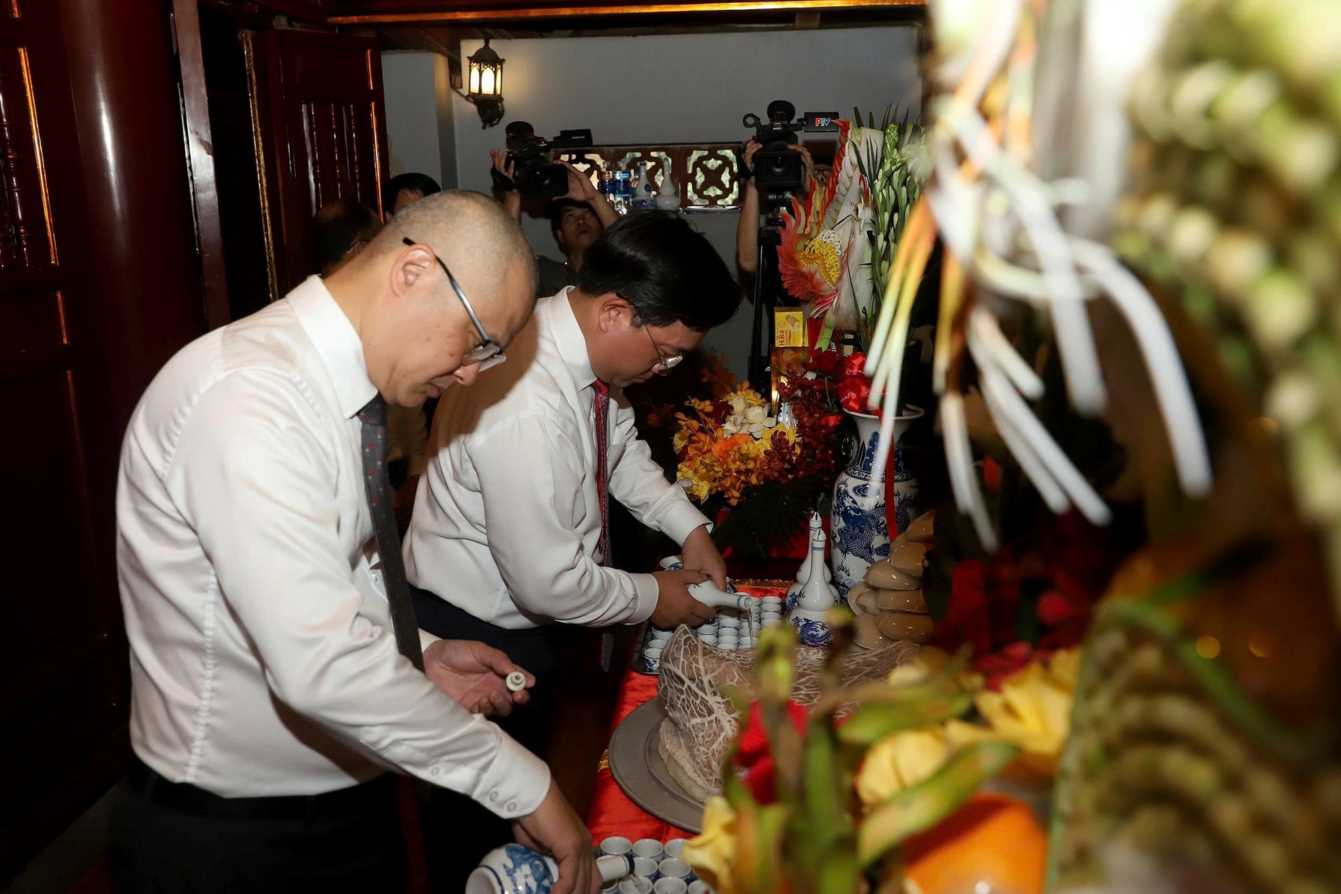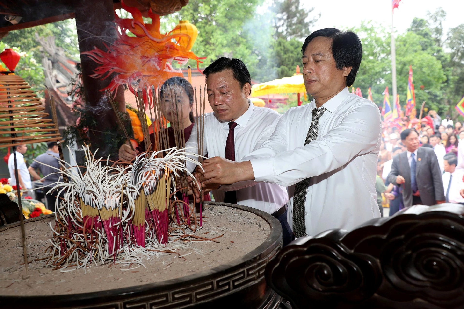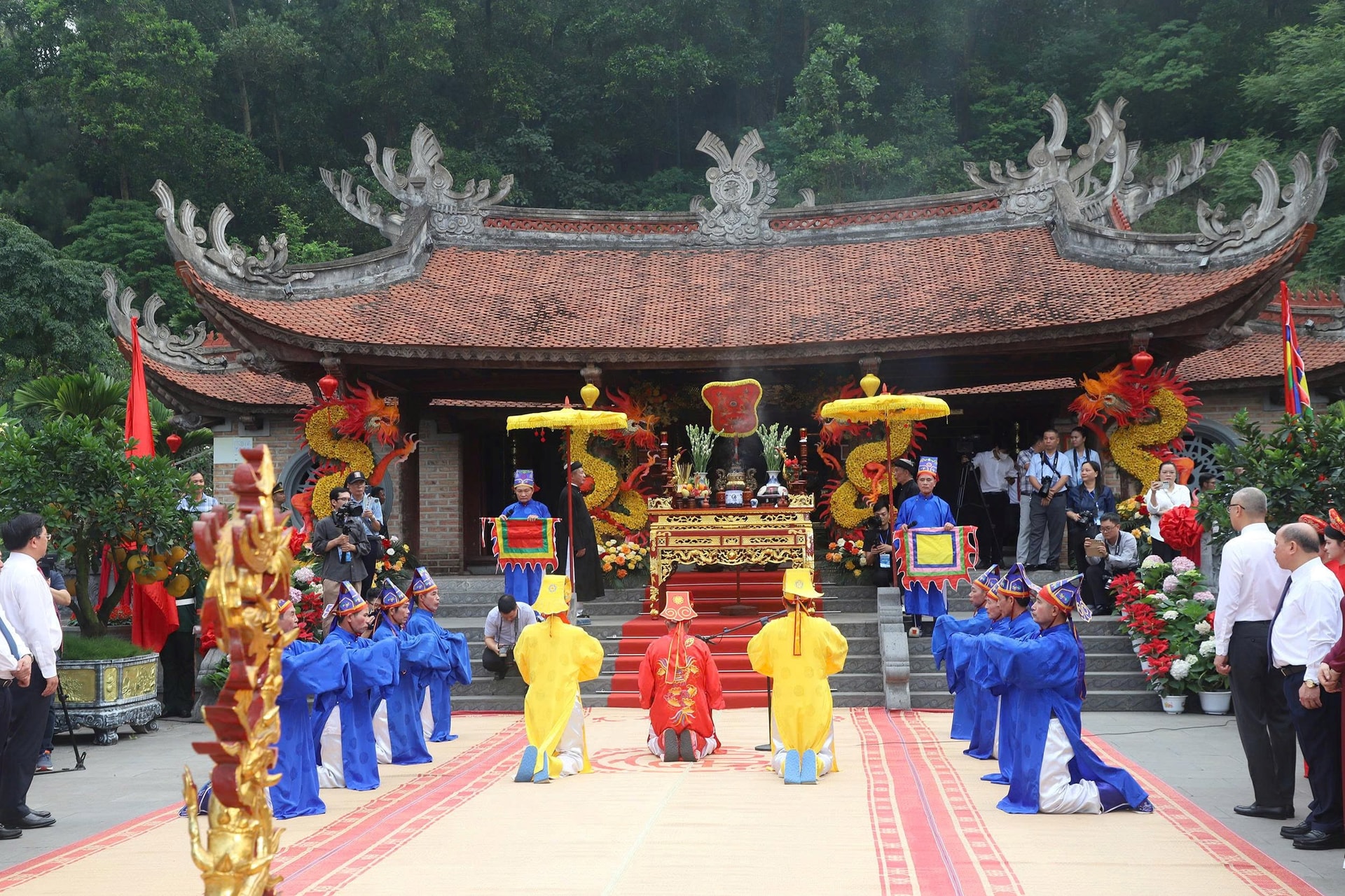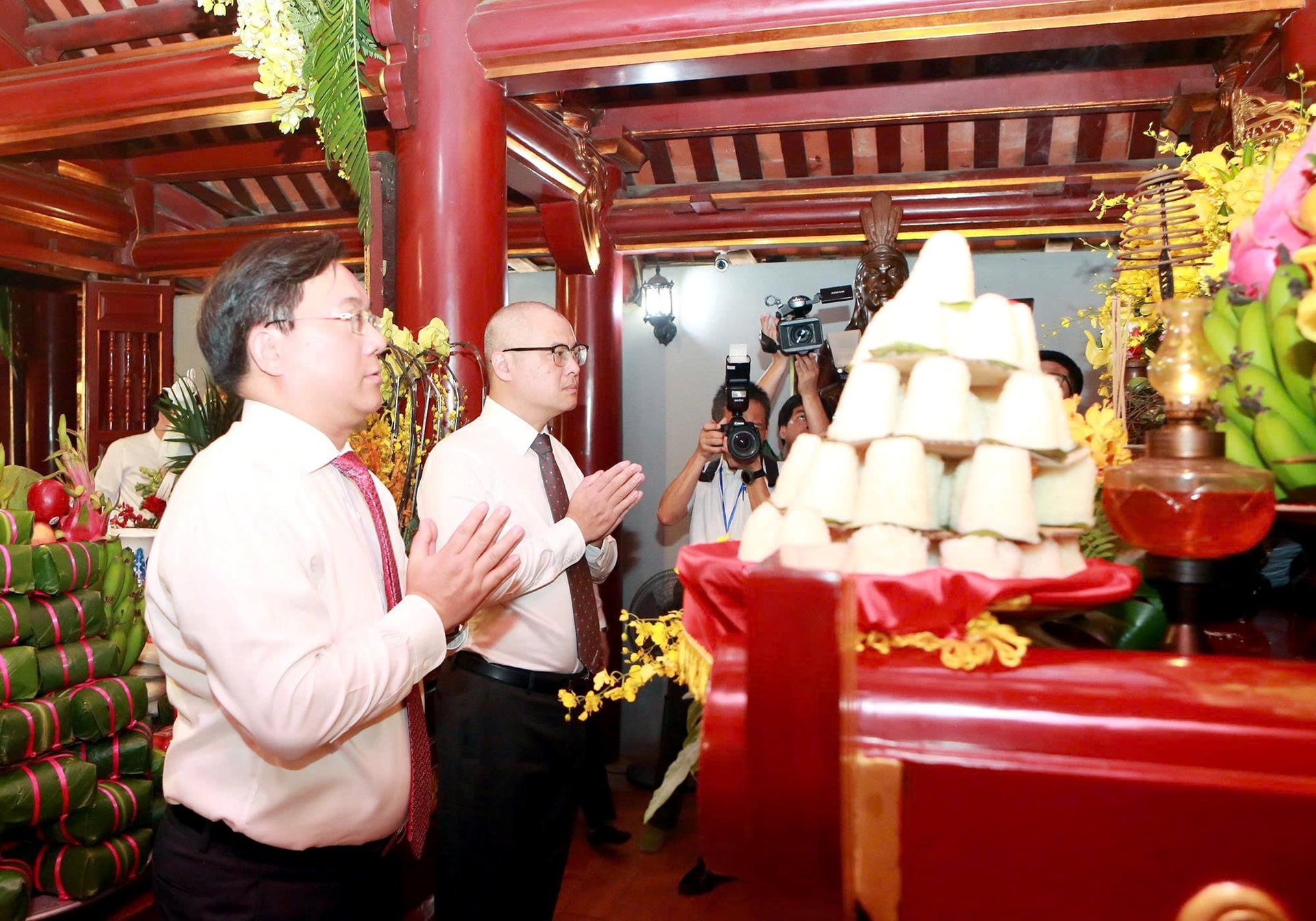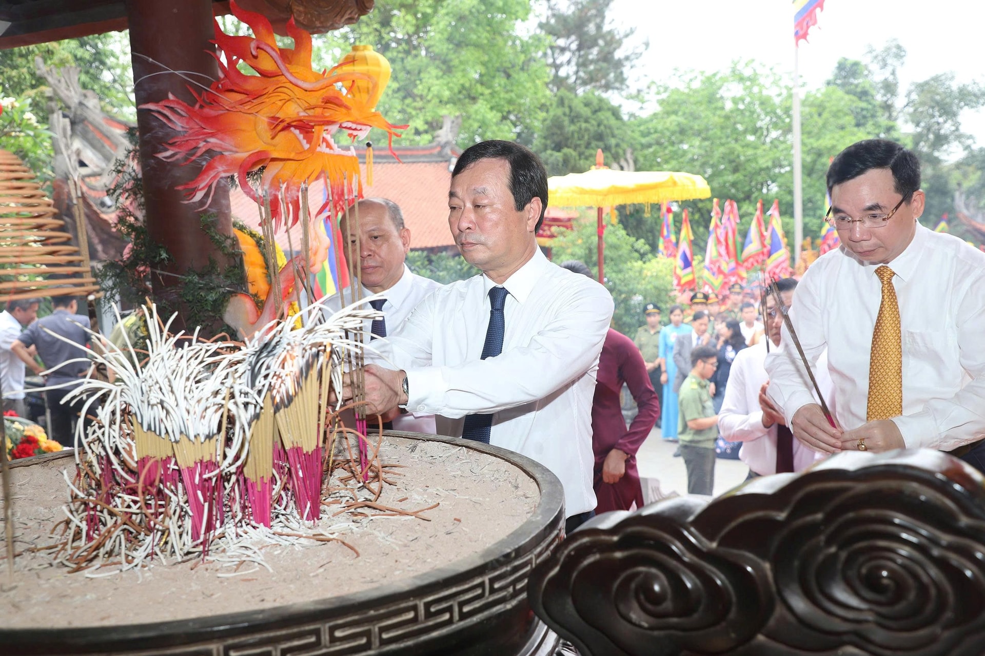 Đồng chí Bí thư Tỉnh ủy Phạm Đại Dương, Trưởng Đoàn ĐBQH tỉnh và đồng chí Phó Bí thư Tỉnh ủy, Chủ tịch UBND tỉnh Trần Duy Đông vào thượng cung dâng hương, hoa, lễ vật tri ân công Đức Quốc Tổ Lạc Long Quân.