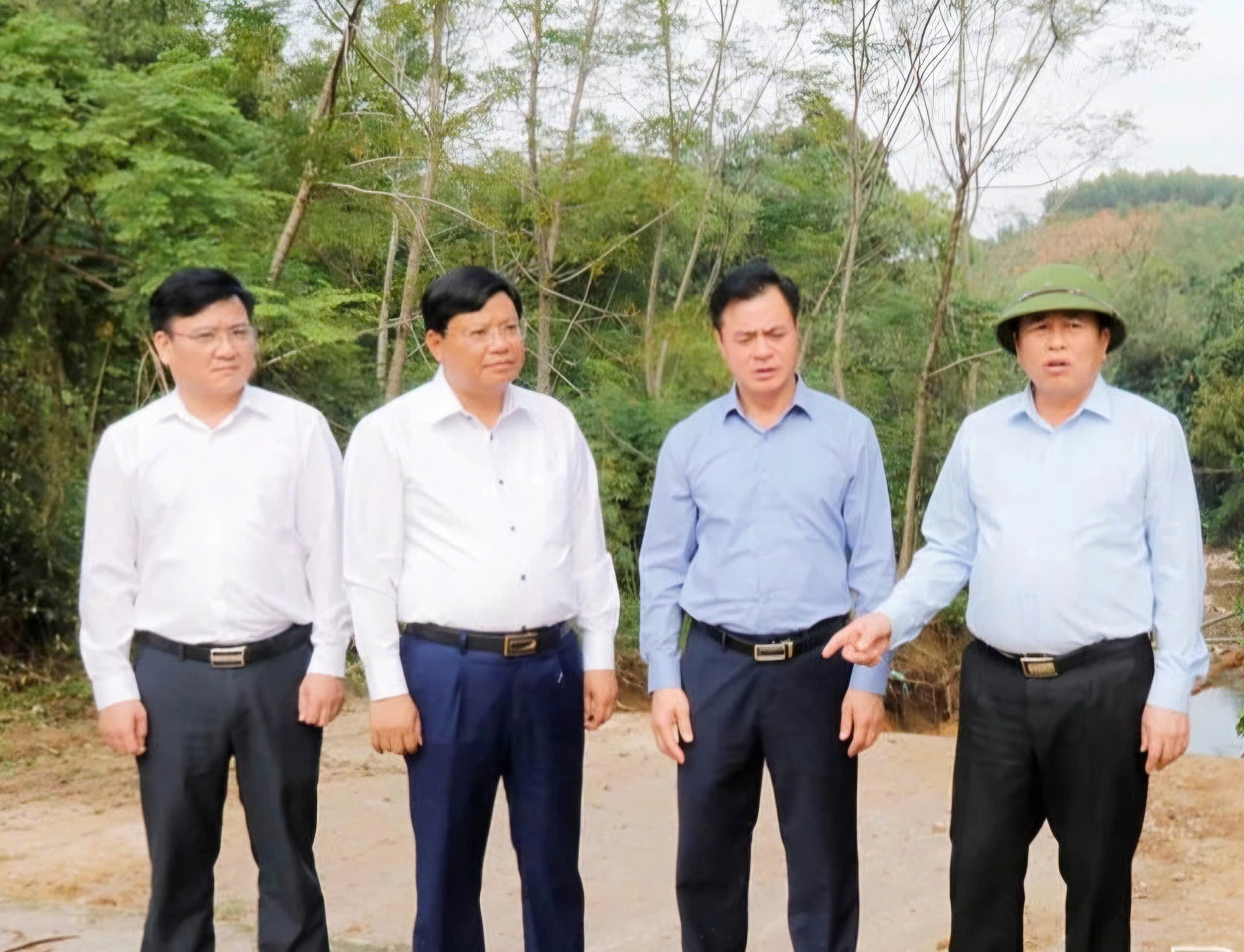Phó Chủ tịch UBND tỉnh Phú Thọ Đinh Công Sứ (người ngoài cùng đội mũ) cùng đoàn công tác kiểm tra tại hồ Suối Rồng, xã Thanh Thủy.