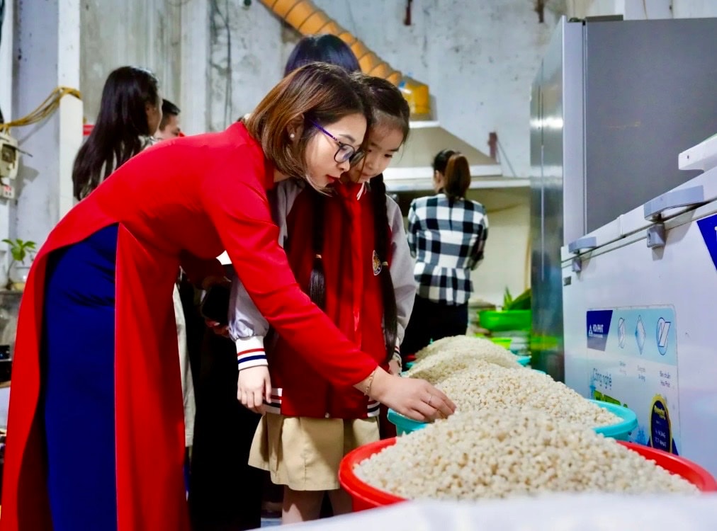 Học sinh phường Phú Thượng tham quan, tìm hiểu lịch sử, văn hóa và nghề làm xôi truyền thống của địa phương. Ảnh: PV