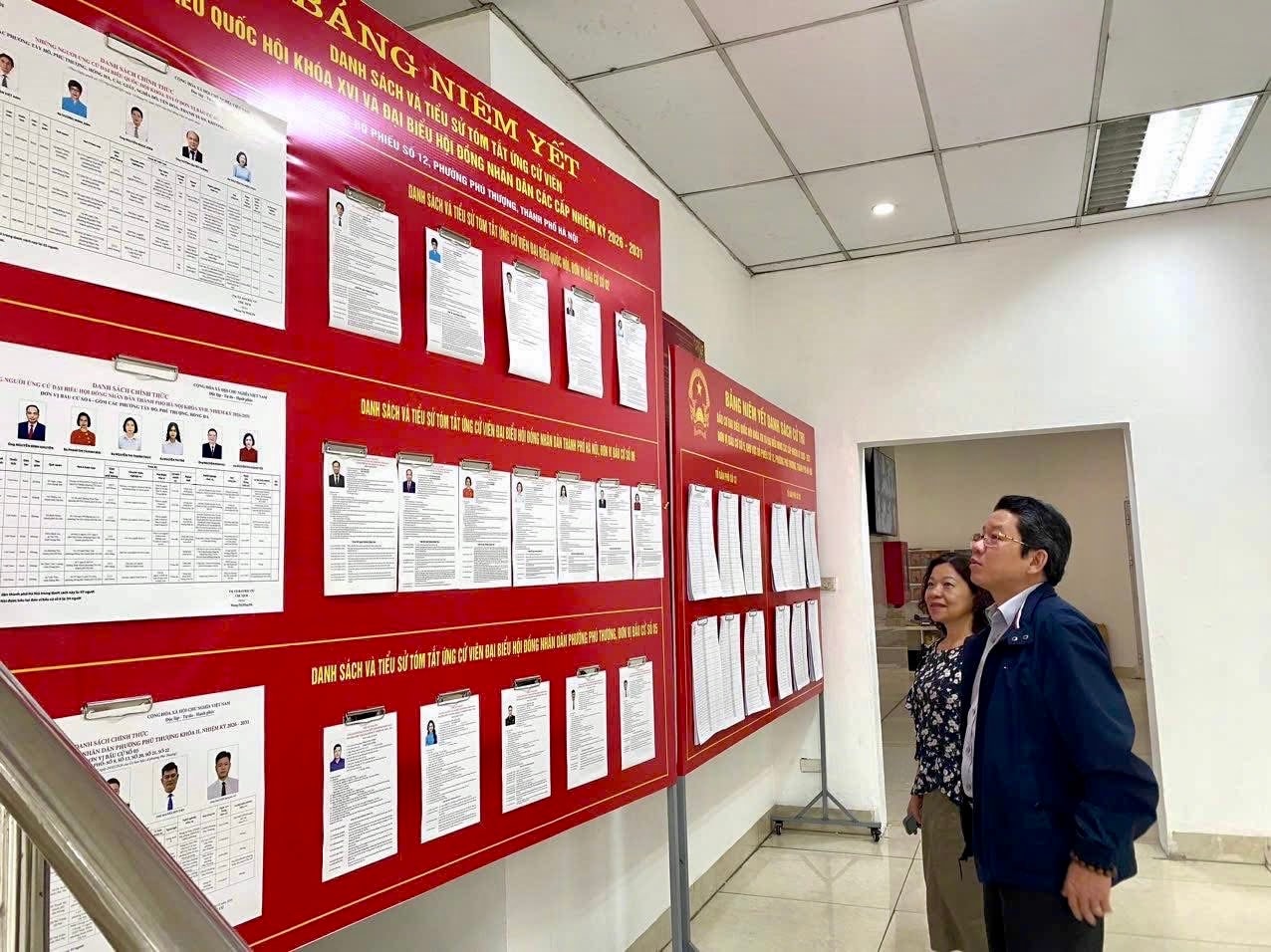 Đại diện Ủy ban MTTQ Việt Nam phường Phú Thượng kiểm tra việc niêm yết Danh sách và tiểu sử tóm tắt của ứng cử viên trước ngày bầu cử. Ảnh: PV