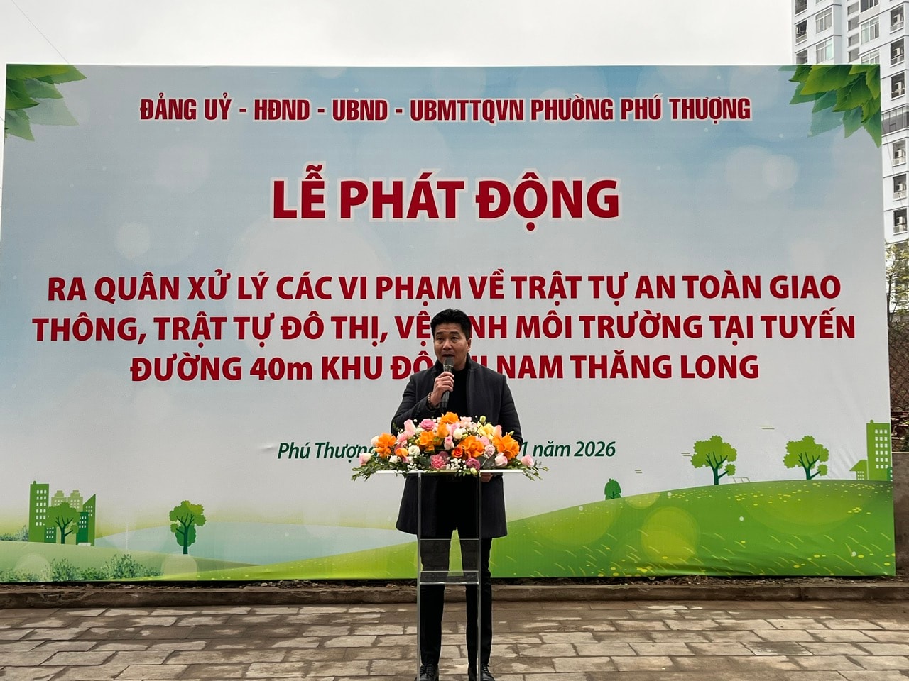 Phát biểu tại lễ phát động, Phó Chủ tịch UBND phường Phú Thượng Võ Thanh Tùng nhấn mạnh, tuyến đường 40m Nam Thăng Long là trục giao thông quan trọng của phường, có mật độ phương tiện lưu thông lớn, đặc biệt trong dịp Tết Nguyên đán Bính Ngọ 2026. Bên cạnh những kết quả đã đạt được trong công tác bảo đảm trật tự đô thị và vệ sinh môi trường, trên tuyến đường vẫn còn tồn tại tình trạng lấn chiếm vỉa hè, lòng đường, buôn bán không đúng quy định, vệ sinh môi trường chưa bảo đảm, ảnh hưởng đến mỹ quan đô thị, trật tự an toàn giao thông và đời sống sinh hoạt của nhân dân.