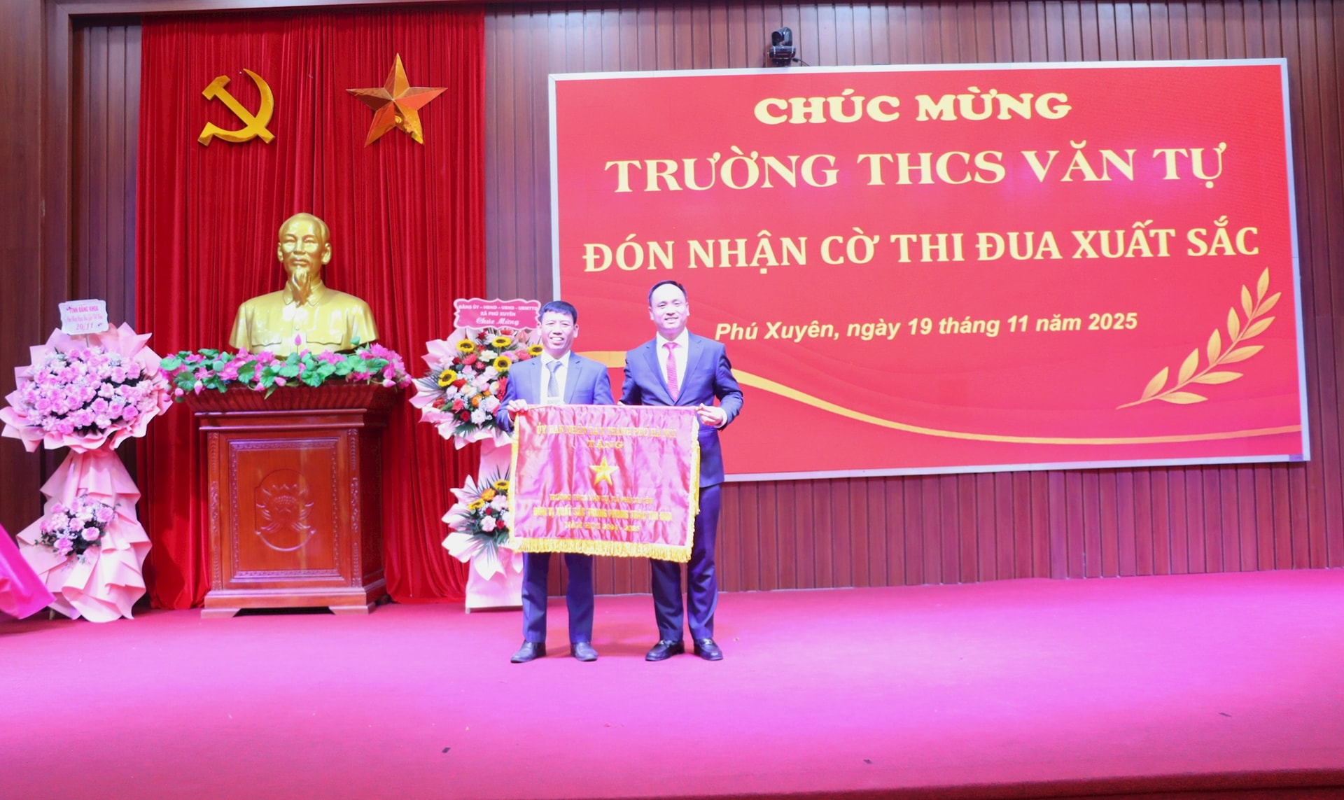 Lãnh đạo xã Phú Xuyên trao Cờ thi đua xuất sắc cho Trường THCS Văn Tự. Ảnh: Sơn Tùng