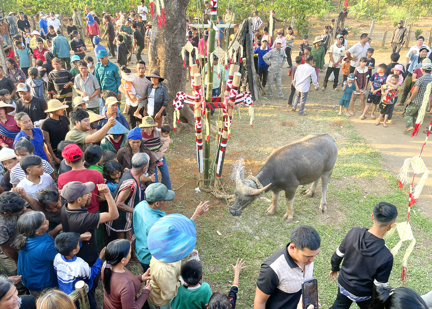 Một thủ tục không thể thiếu trong sự kiện là người dân trong làng lần lượt ném gạo và dây rừng vào con trâu hiến sinh. Theo người dân, đây là phong tục nhằm gửi gắm mong ước vào con vật sẽ hiến tế cho Yàng. Trong đó, gạo tượng trưng cho đời sống no đủ, mùa màng bội thu; dây rừng nhắc nhở người dân buôn làng luôn nhớ về nguồn cội