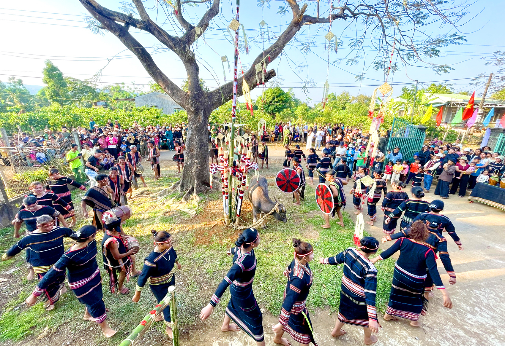 Ngay sau lễ cúng là màn múa khiên đặc sắc do các chàng trai mặc khố thể hiện với đao, khiên và các động tác dũng mãnh để tôn vinh chiến thắng.