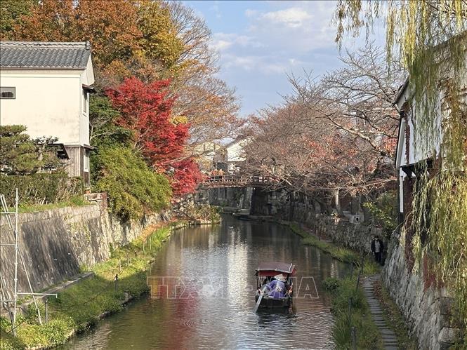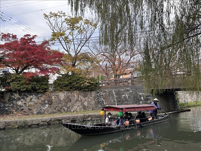 Tour du lịch chèo thuyền gỗ dọc theo kênh đào là một điểm nhấn của hoạt động du lịch tại Omi Hachiman (Nhật Bản). Ảnh: Nguyễn Tuyến/PV TTXVN tại Nhật Bản
