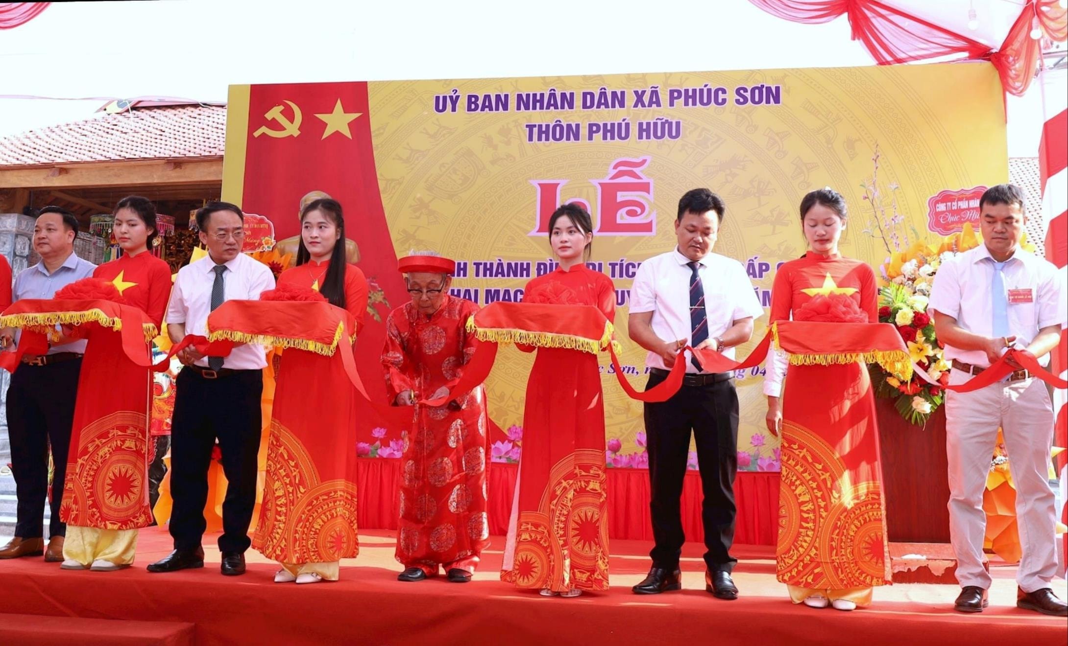 Lãnh đạo Đảng ủy, HĐND, UBND, Ủy ban MTTQ Việt Nam xã Phúc Sơn và thôn Phú Hữu cắt băng khánh thành đình làng. Ảnh: Kim Nhuệ