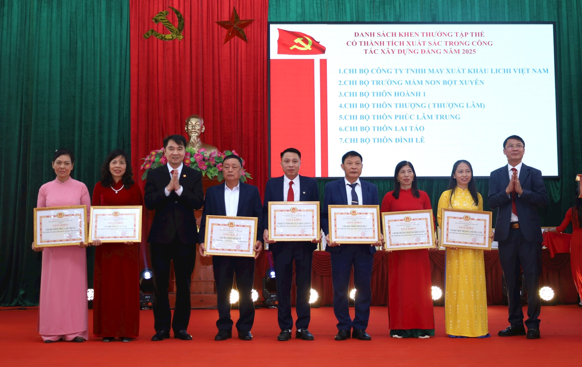 Phó Bí thư Thường trực Đảng ủy xã Phúc Sơn Trần Việt Thắng và Chủ tịch UBND xã Phúc Sơn Trần Xuân Hải khen thưởng các tập thể, cá nhân có thành tích trong công tác xây dựng Đảng. Ảnh: Kim Nhuệ