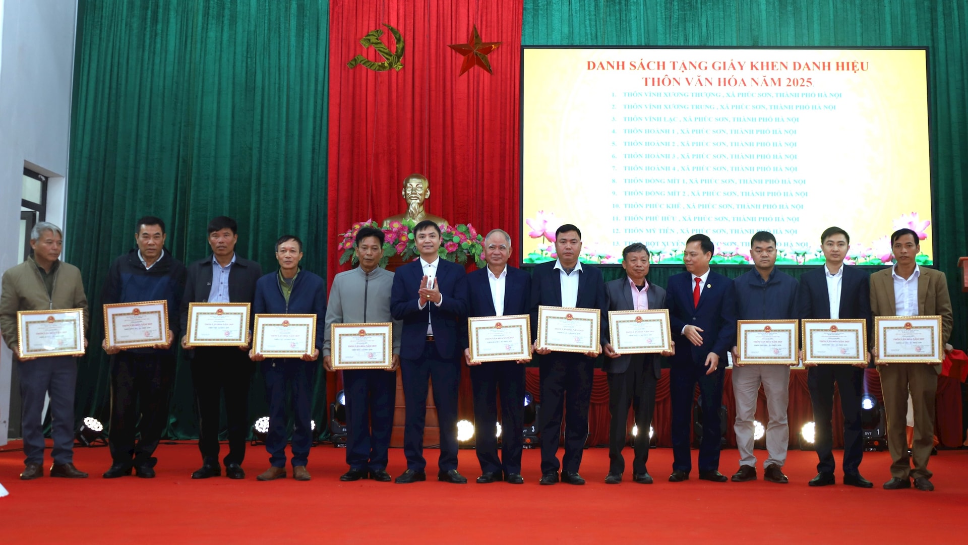 Lãnh đạo xã Phúc Sơn tặng các địa phương danh hiệu Thôn văn hóa năm 2025. Ảnh: Kim Nhuệ
