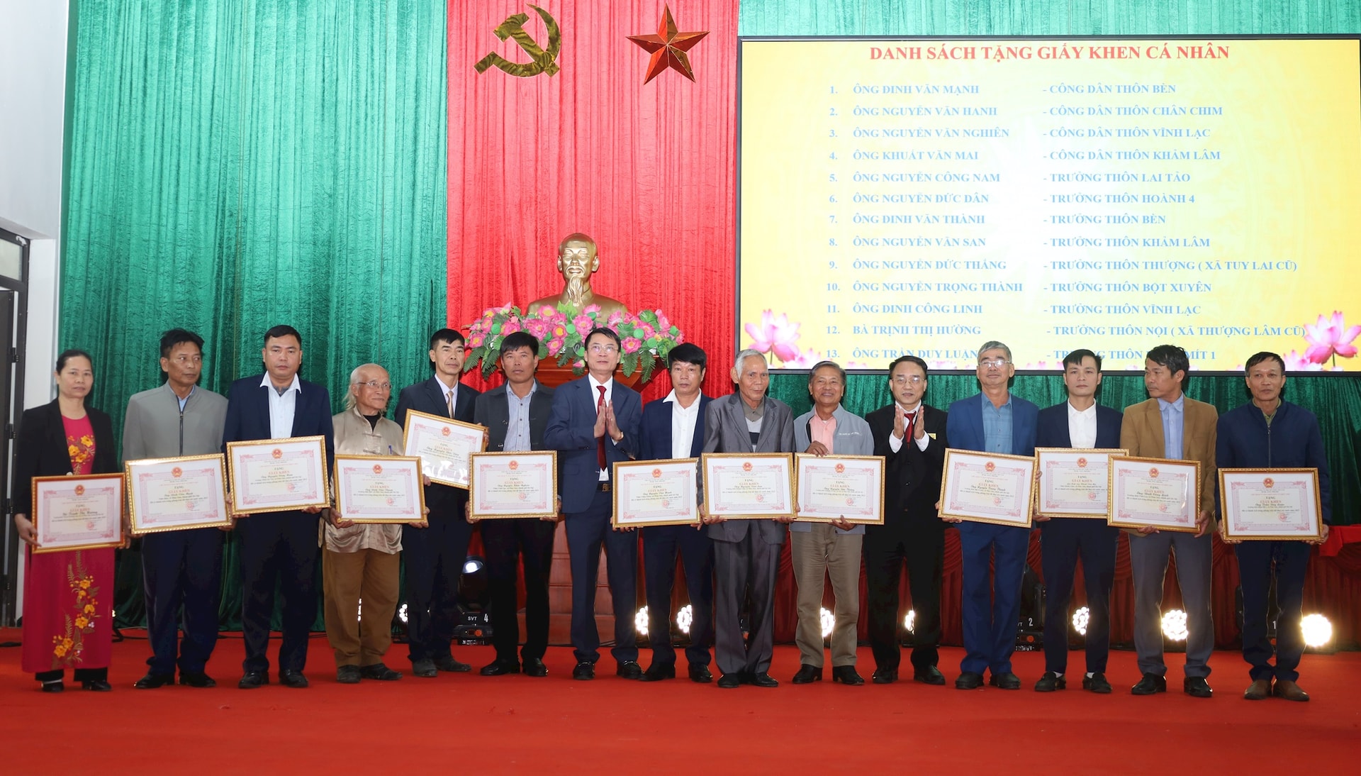 Bí thư Đảng ủy, Chủ tịch HĐND xã Phúc Sơn Phan Văn Sự và Phó Chủ tịch HĐND xã Phúc Sơn Vũ Văn Chuyên khen thưởng các cá nhân đạt danh hiệu Chiến sĩ thi đua cơ sở. Ảnh: Kim Nhuệ