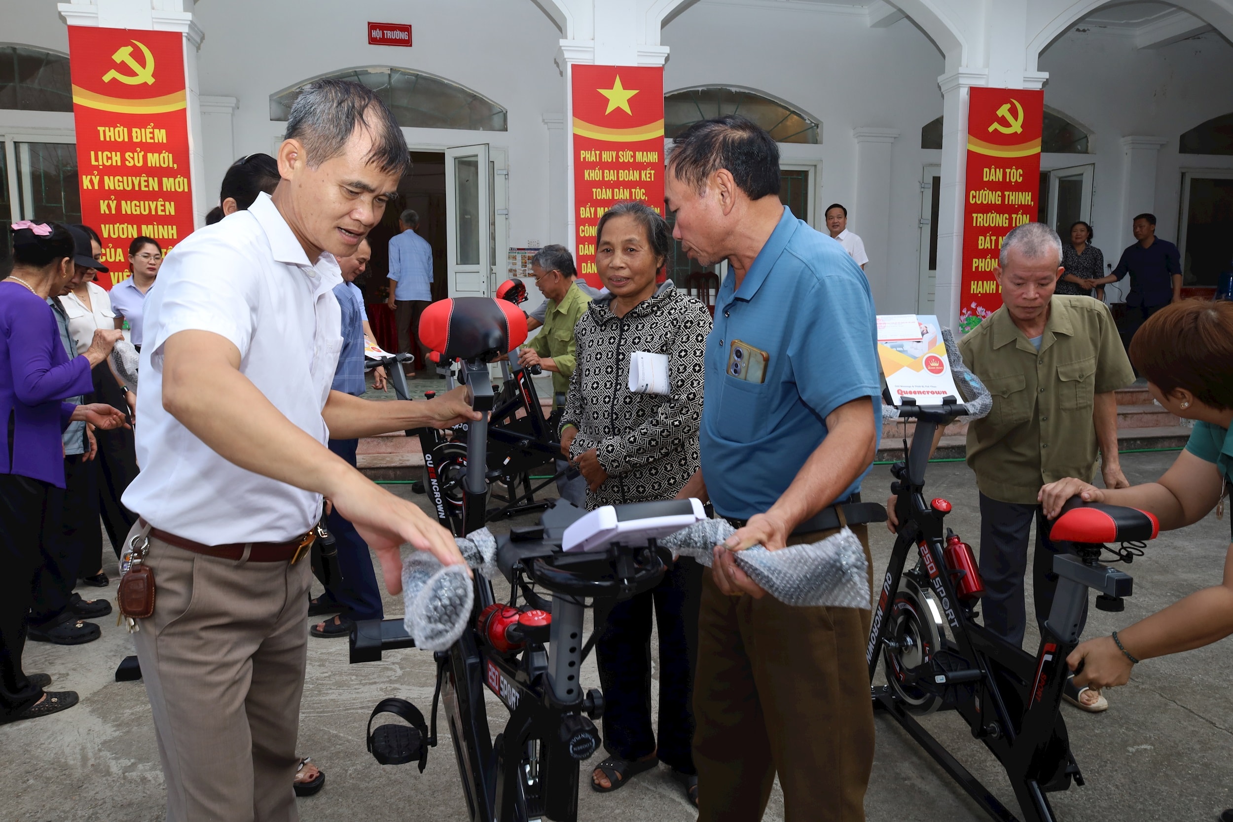 Chủ tịch Ủy ban MTTQ Việt Nam xã Phúc Sơn Lê Thành Đoàn và Ban Chủ nhiệm Hội Thiện nguyện thôn Chân Chim trao tặng xe đạp tập thể dục tại nhà cho các hộ gia đình. Ảnh: Kim Nhuệ