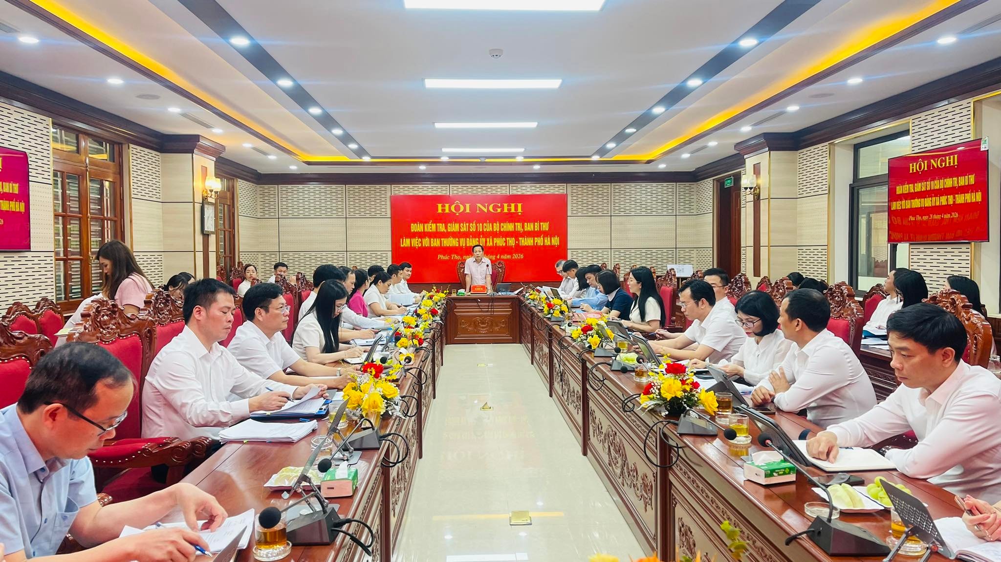 Tại hội nghị, Phó Bí thư Thường trực Đảng ủy Nguyễn Việt Cường báo cáo Đoàn về kết quả tự kiểm tra, giám sát của Ban Thường vụ Đảng ủy xã Phúc Thọ; trong đó, nhấn mạnh công tác lãnh đạo, chỉ đạo việc tổ chức và hoạt động của các cơ quan, đơn vị ở địa phương sau vận hành chính quyền địa phương hai cấp; các nhiệm vụ, giải pháp nhằm bảo đảm thực hiện mục tiêu tăng trưởng… Đồng thời, Chủ tịch UBND xã Kiều Trọng Sỹ cùng Ban Thường vụ Đảng ủy xã cũng nêu những kết quả nổi bật, khó khăn của Phúc Thọ kể từ khi thành lập và có kiến nghị, đề xuất với Đoàn kiểm tra, giám sát.