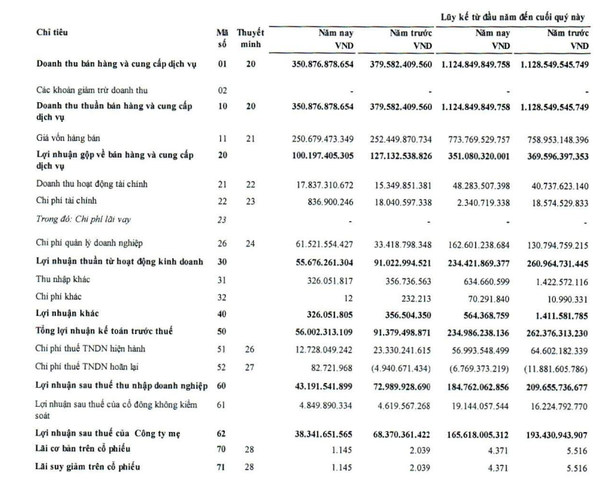 Ở chiều ngược lại, hoạt động tài chính là điểm sáng hiếm hoi khi chi phí tài chính giảm tới 95%, chỉ còn 837 triệu đồng, trong khi doanh thu tài chính tăng mạnh lên 17,8 tỷ đồng. Tuy nhiên, chi phí quản lý doanh nghiệp lại tăng gần gấp đôi, lên gần 62 tỷ đồng, khiến lợi nhuận sau thuế chỉ còn 38 tỷ đồng – giảm 44% so với cùng kỳ.