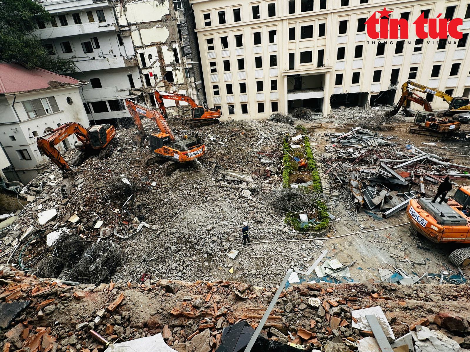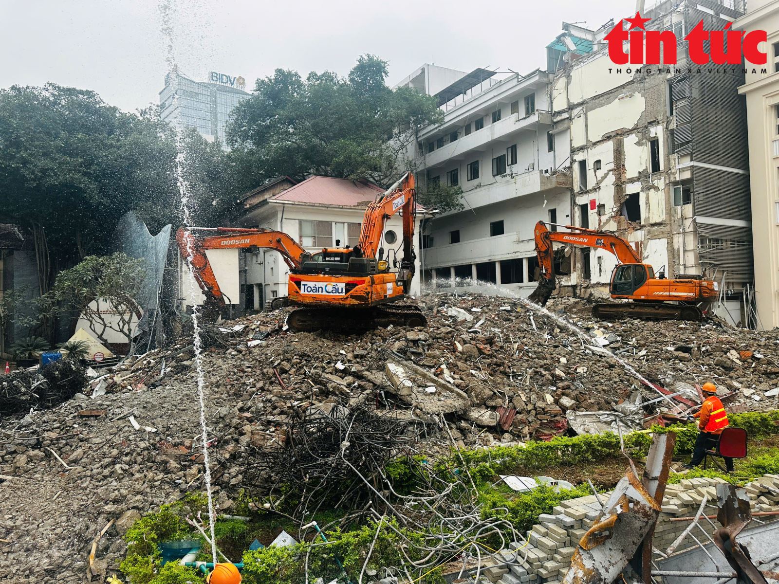 Để hạn chế bụi phát sinh trong quá trình phá dỡ, UBND phường Hoàn Kiếm đã chỉ đạo các đơn vị liên quan tăng cường kiểm tra, giám sát hoạt động thi công. Ghi nhận vào chiều 11/3, tại công trường thi công dự án cho thấy nhiều máy xúc đang thực hiện phá dỡ các cấu trúc bê tông còn lại của các công trình cũ và thu gom phế thải xây dựng.