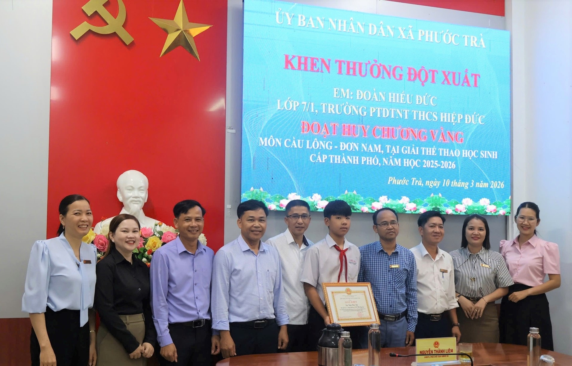 Tại buổi khen thưởng, ông Nguyễn Thành Liêm, Phó Chủ tịch UBND xã Phước Trà trao giấy khen của Chủ tịch UBND xã và tiền thưởng cho em Đoàn Hiếu Đức. Lãnh đạo địa phương nhấn mạnh thành tích này không chỉ là niềm tự hào của cá nhân và gia đình mà còn góp phần mang lại vinh dự cho nhà trường và địa phương.