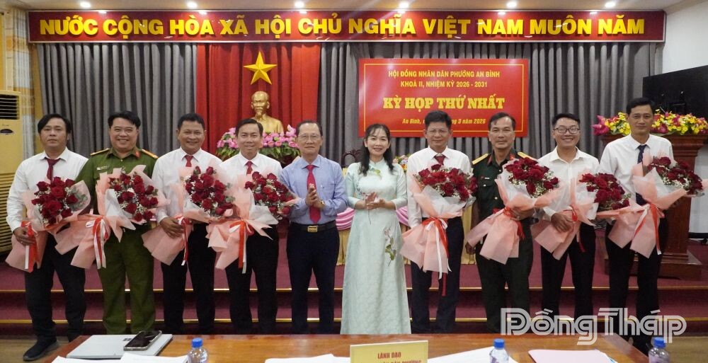 Đồng chí Nguyễn Văn Khơi, Bí thư Đảng ủy, Chủ tịch Hội đồng nhân dân phường An Bình (thứ 5 từ trái sang) và đồng chí Nguyễn Phúc Nhi, Phó Chủ tịch HĐND phường tặng hoa chúc mừng các đồng chí Ủy viên Ủy ban nhân dân phường nhiệm kỳ 2026 - 2031.