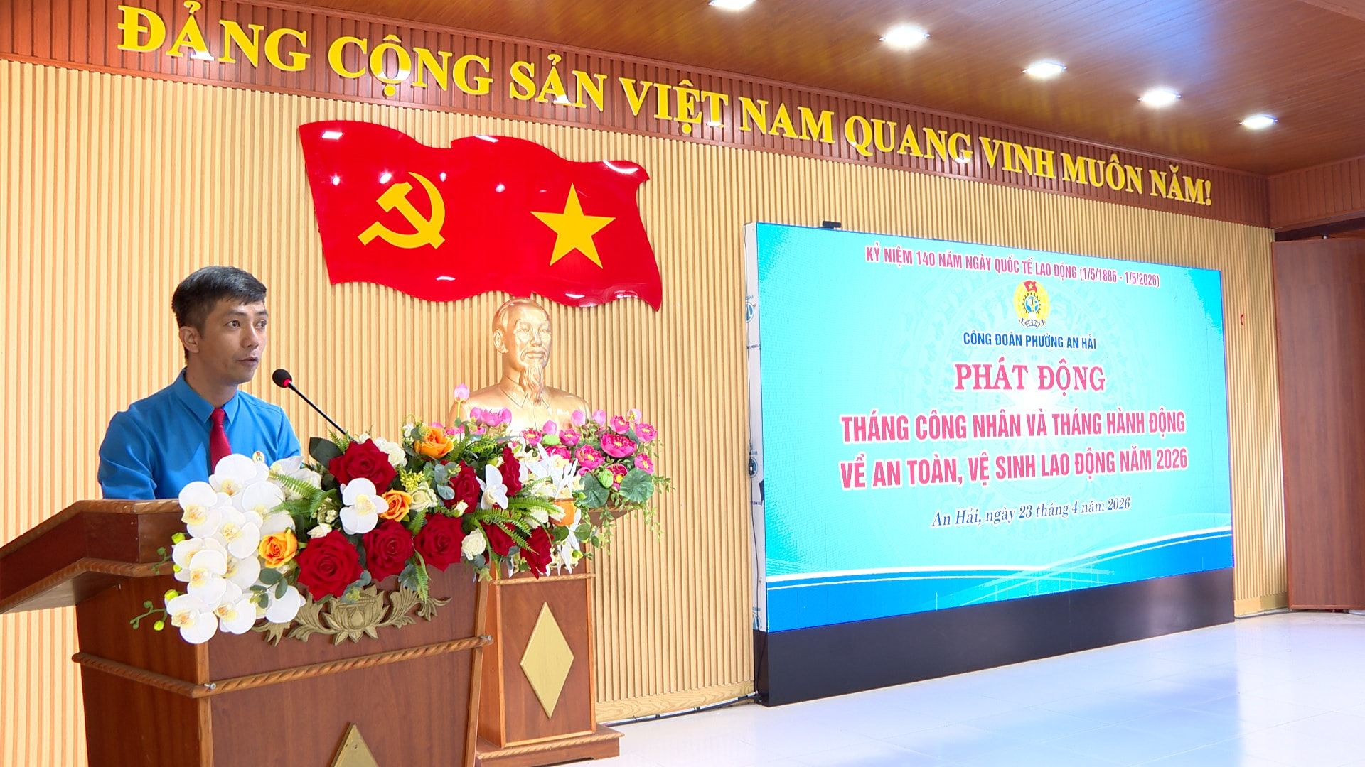 Ông Đỗ Đức Tình, Chủ tịch Công đoàn phường An Hải phát động Tháng Công nhân và Tháng Hành động về an toàn vệ sinh lao động năm 2026. Ảnh: TẤN YÊN