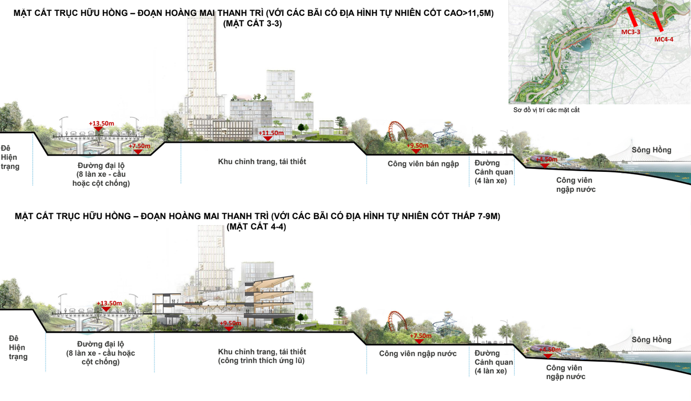 Bên cạnh đó, việc không xây dựng mới các tuyến đê giúp giữ nguyên trạng hệ thống thoát lũ của sông Hồng, đáp ứng nghiêm ngặt các tiêu chuẩn về phòng chống thiên tai. Đồng thời, tạo điều kiện chỉnh trang các khu vực bãi sông hiện hữu như Chu Phan, Tráng Việt, Tàm Xá, Xuân Canh, Long Biên, Cự Khối... biến nơi đây thành không gian xanh và khu vui chơi giải trí cho người dân Thủ đô.