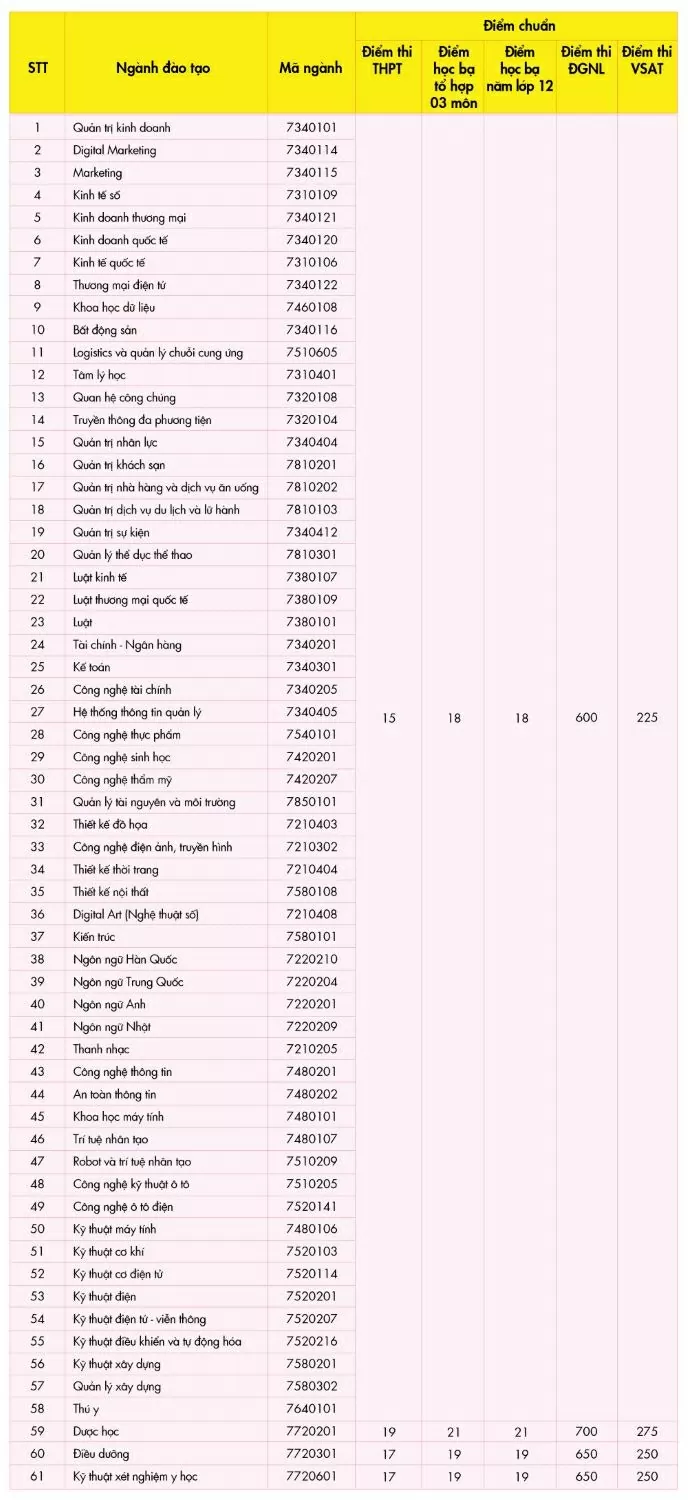 Bên cạnh đó, nhà trường tiếp tục duy trì và mở rộng các kỳ thi đánh giá độc lập. Trường dự kiến tổ chức kỳ thi đánh giá đầu vào đại học trên máy tính V-SAT năm 2026 vào ngày 22/3, tạo thêm một kênh xét tuyển sớm cho thí sinh có nhu cầu đăng ký vào trường.