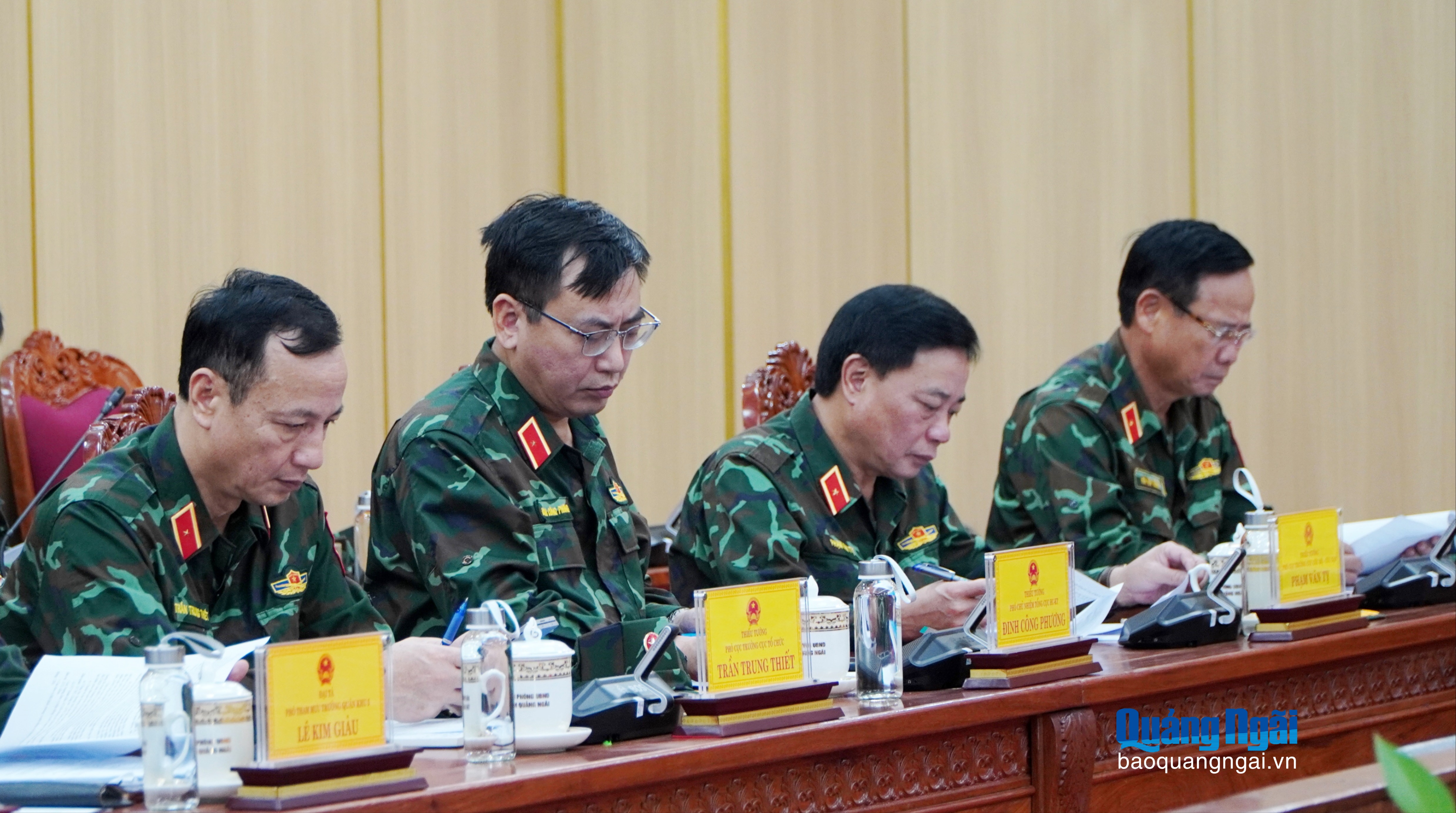 Thượng tướng Phạm Trường Sơn, Phó Tổng tham mưu trưởng QĐND Việt Nam; Phó Bí thư Tỉnh ủy, Chủ tịch UBND tỉnh Nguyễn Hoàng Giang; Phó Chủ tịch UBND tỉnh Đỗ Tâm Hiển chủ trì cuộc họp tại điểm cầu Quảng Ngãi.