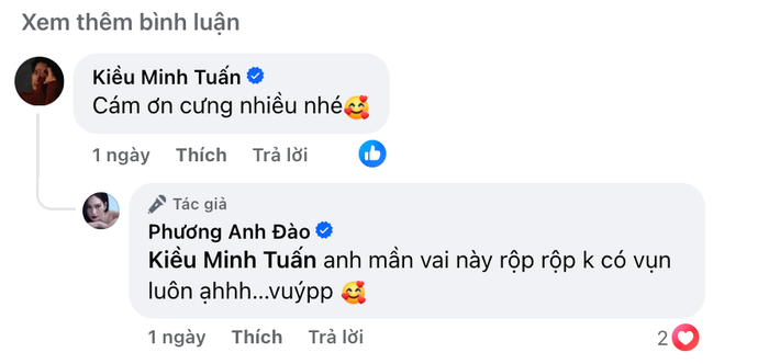 Đáng chú ý, trong bài viết, Phương Anh Đào dành nhiều lời khen cho dàn diễn viên, đặc biệt là Kiều Minh Tuấn - người được cô nhận xét là "trung tâm của cảm xúc" trong phim. Ngay dưới phần bình luận, nam diễn viên đã trực tiếp để lại lời nhắn: "Cám ơn cưng nhiều nhé", thể hiện sự trân trọng trước những chia sẻ từ đồng nghiệp.