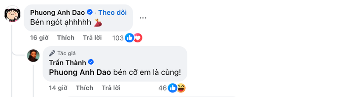 Cụ thể, dưới bài đăng của Trấn Thành, Phương Anh Đào viết: "Bén ngót à", kèm biểu tượng cảm xúc mặt cười. Bình luận này nhanh chóng nhận được hơn trăm lượt thích và phản hồi từ khán giả. Không lâu sau đó, Trấn Thành trực tiếp đáp lại lời Phương Anh Đào: "Bén cỡ em là cùng!".