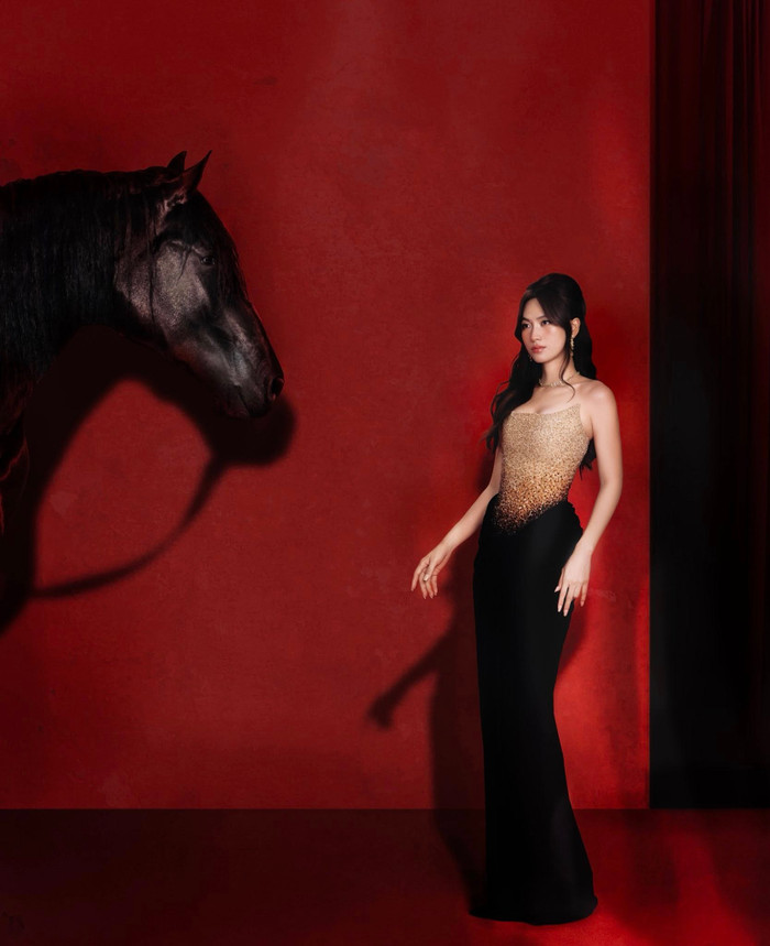 Trong loạt ảnh, Phương Anh Đào xuất hiện với trang phục dạ hội dáng dài, phối màu đen - ánh kim, tôn lên vóc dáng thanh mảnh cùng thần thái điềm tĩnh. Sự xuất hiện của chú hắc mã bên cạnh nữ diễn viên tạo nên điểm nhấn thị giác rõ rệt, mang màu sắc biểu tượng và góp phần làm nổi bật tổng thể concept mang hơi hướng cổ điển, trầm lắng nhưng không kém phần mạnh mẽ.