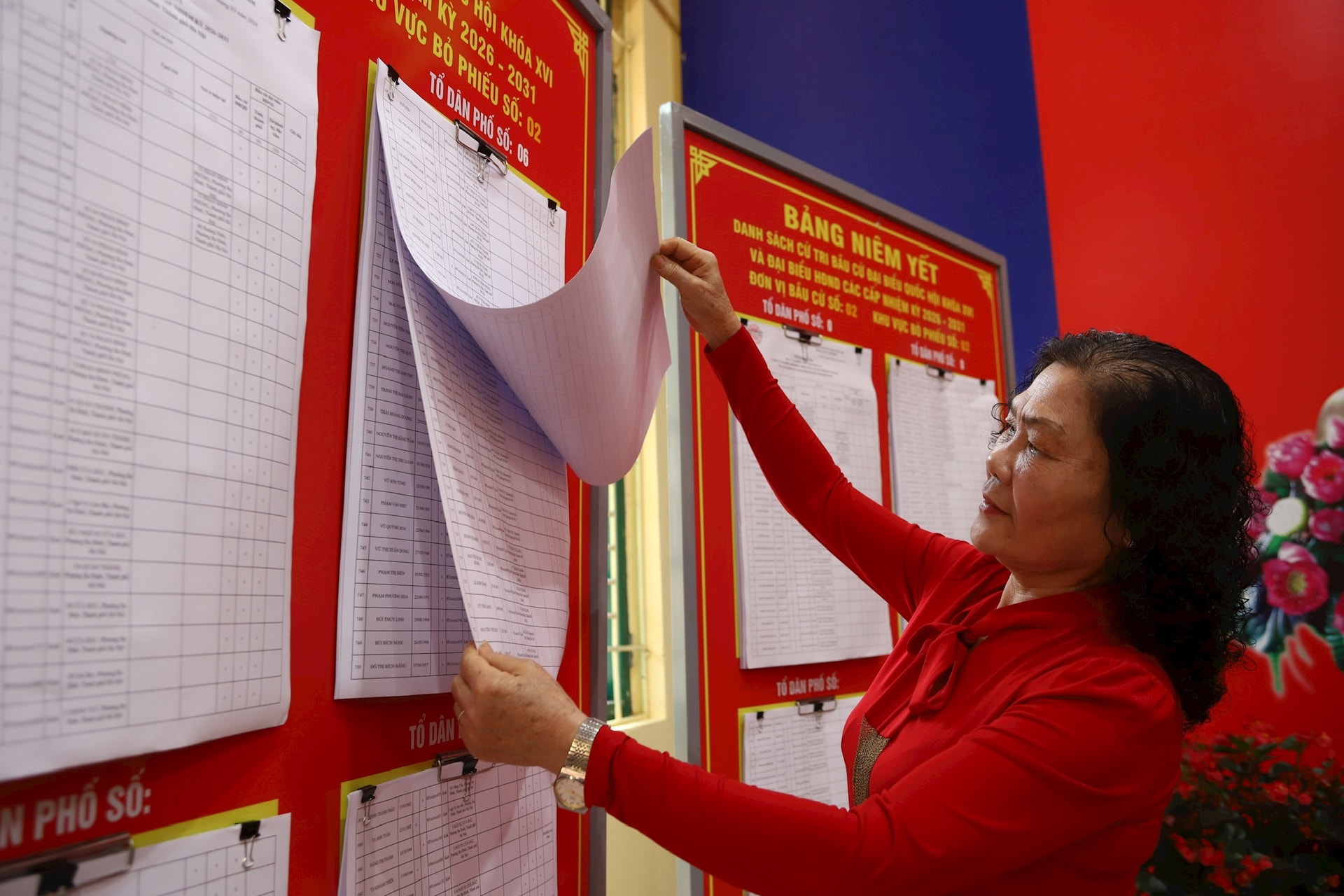 Danh sách cử tri và Quốc hội khóa XVI và đại biểu HĐND các cấp nhiệm kỳ 2026 – 2031 được được niêm yết ở vị trí dễ quan sát cho cử tri tìm hiểu trước khi bỏ phiếu. Ảnh: TT