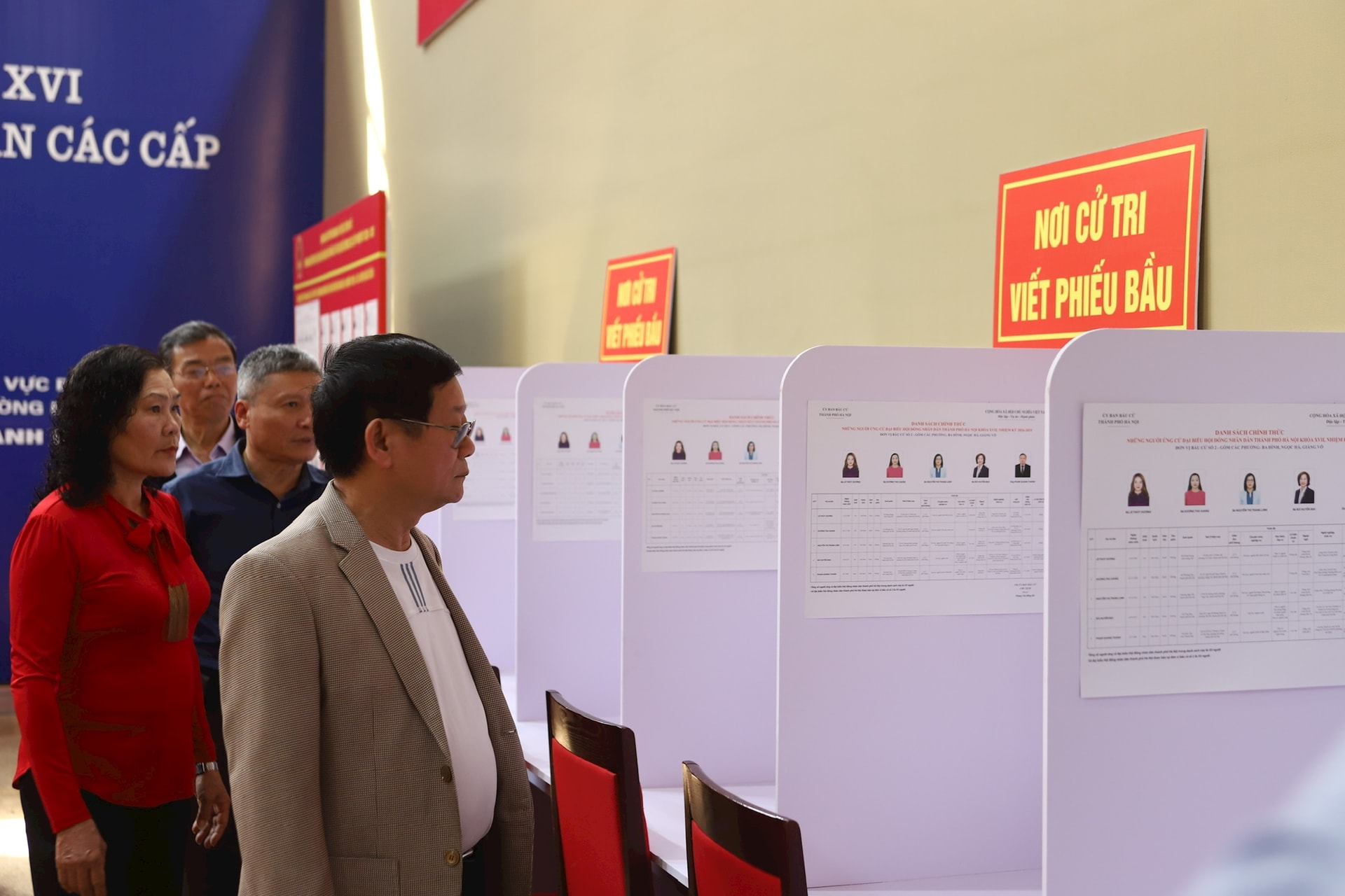 Bí thư Đảng ủy, Chủ tịch HĐND phường Ba Đình Phạm Quang Thanh, Chủ tịch Ủy ban Bầu cử phường kiểm tra công tác chuẩn bị bầu cử tại khu vực bỏ phiếu số 2. Ảnh: TT