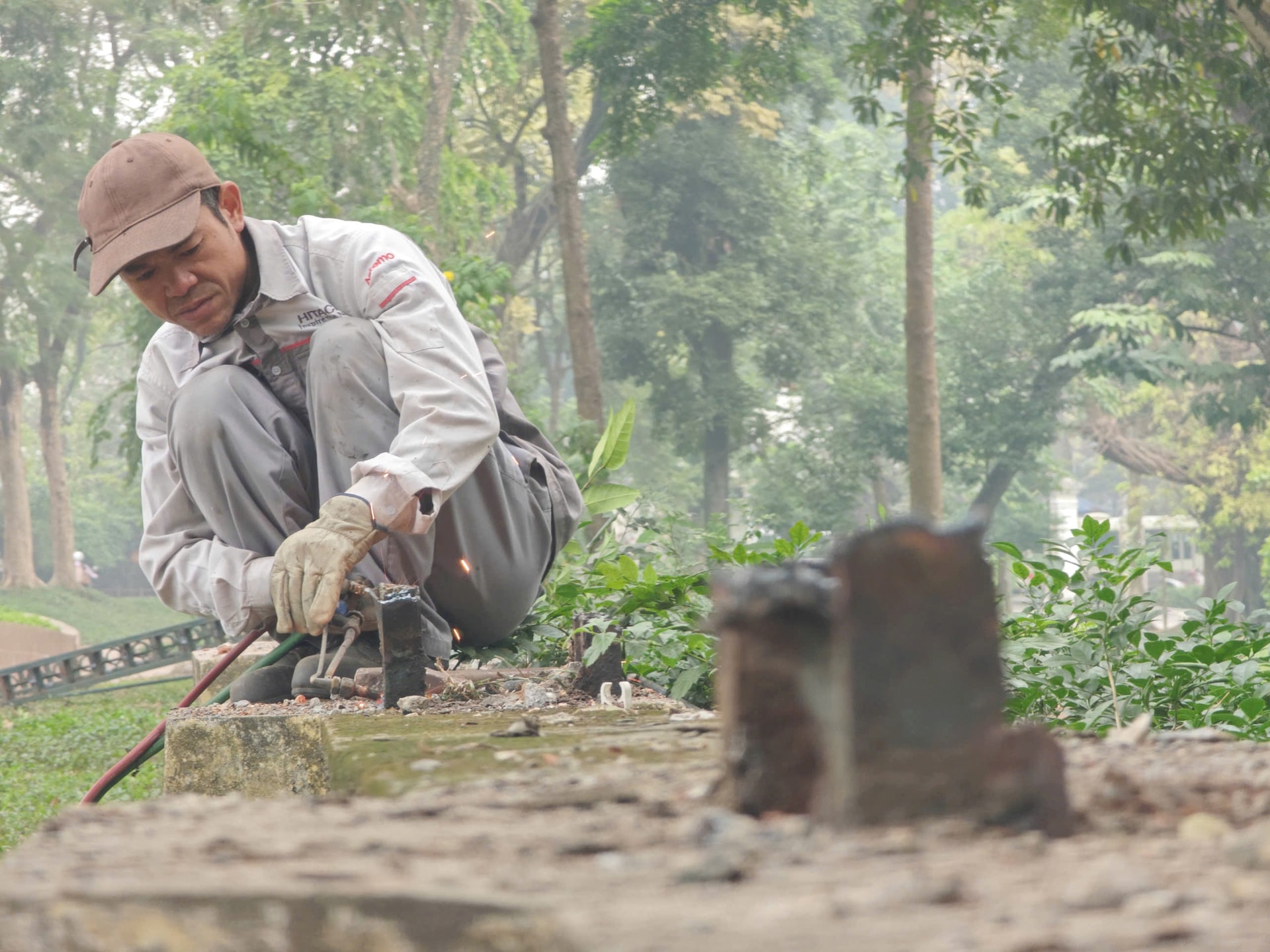 Công nhân tiến hành hạ rào Công viên Bách Thảo. Ảnh: MH