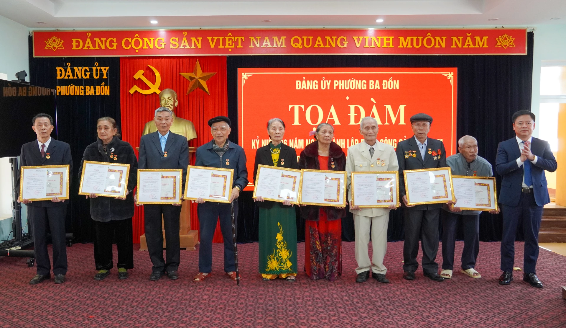 Đồng chí Phạm Quang Ánh, Bí thư Đảng ủy phường Ba Đồn trao huy hiệu Đảng cho các đảng viên - Ảnh: N.H