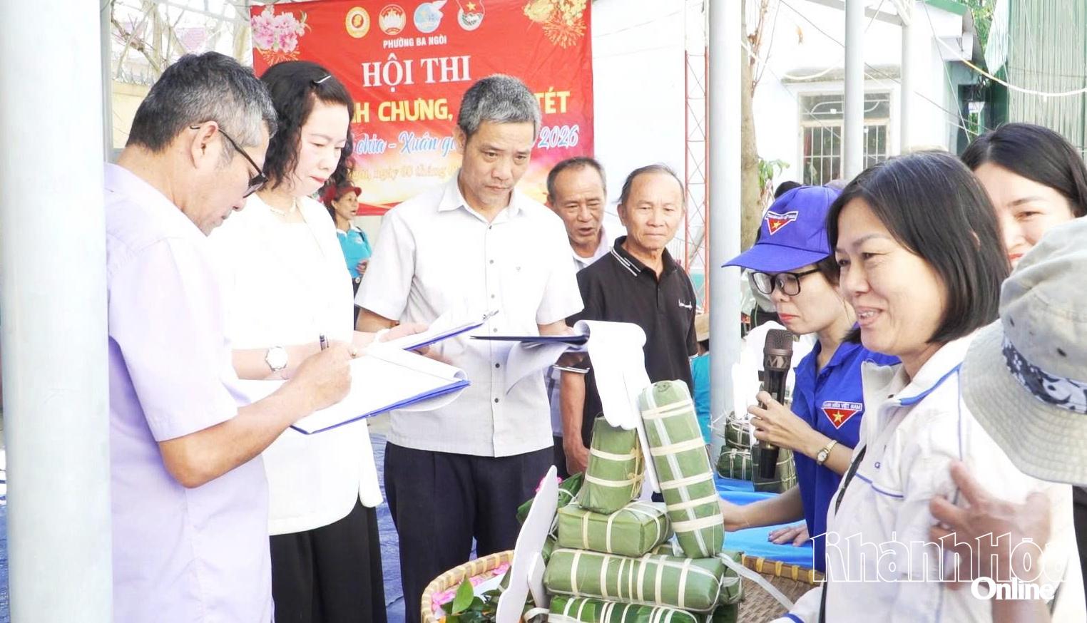 Ban Giám khảo chấm điểm tại nội dung thi gói bánh chưng, bánh tét.