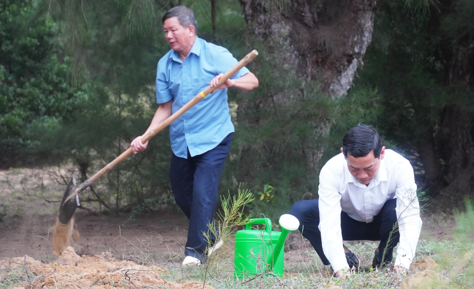 Đại diện lãnh đạo Đảng ủy, UBND phường Bắc Gianh trồng cây phi lao tại tuyến đường ven biển - Ảnh: N.M