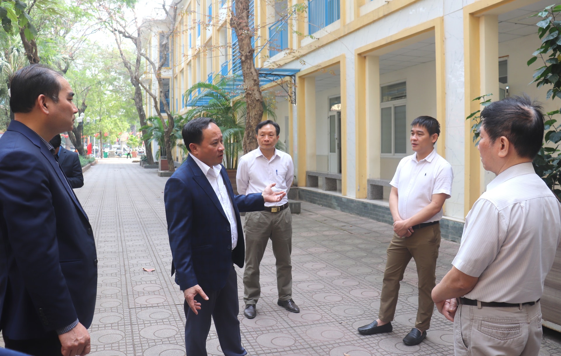 Lãnh đạo phường Bạch Mai kiểm tra khu vực bỏ phiếu tại Đại học Kinh tế Quốc dân, trường Đại học Xây dựng Hà Nội. Ảnh: Linh Chi