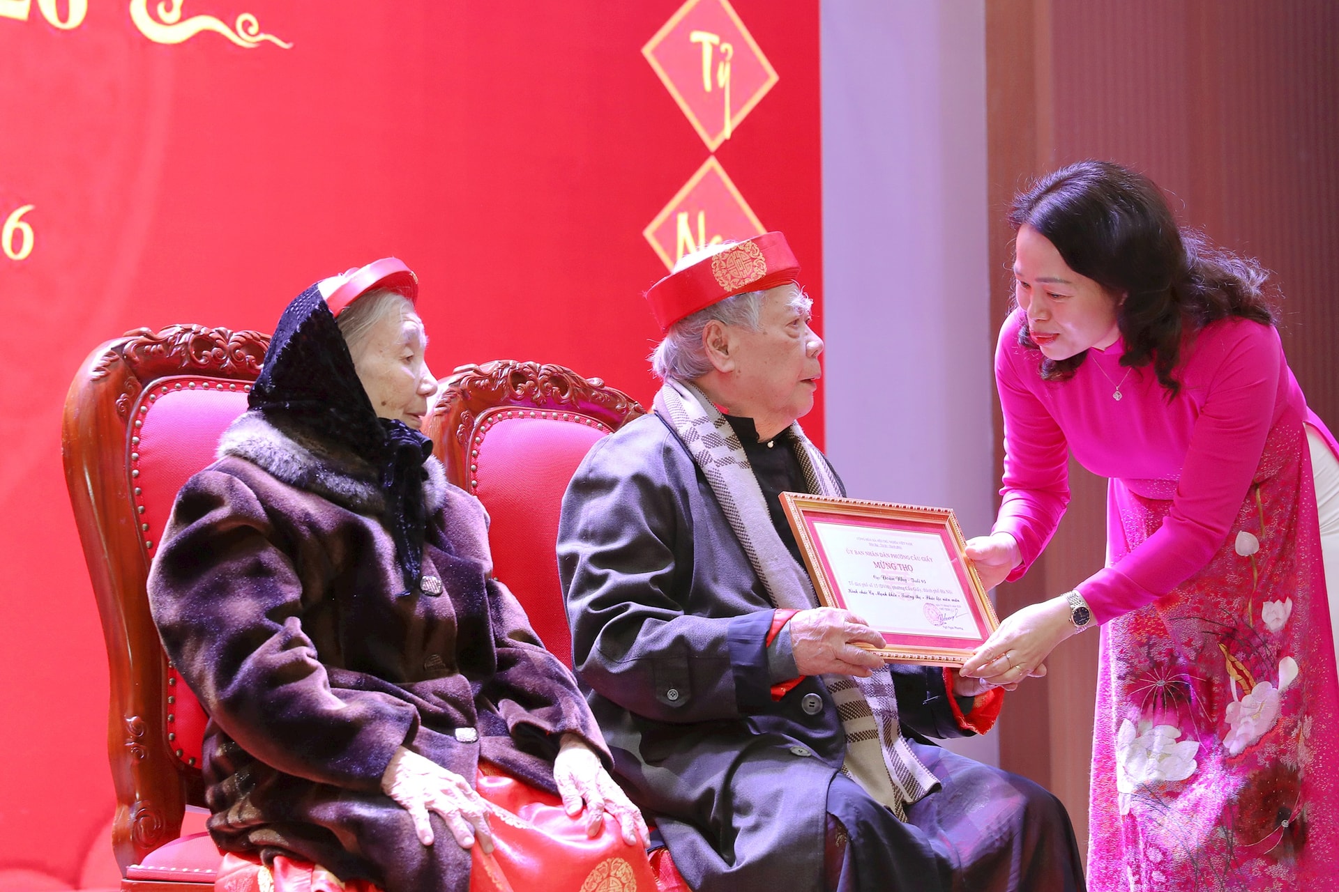 Đồng chí Nguyễn Thị Liễu - Bí thư Đảng ủy, Chủ tịch HĐND phường Cầu Giấy trao thiếp mừng thọ cho cụ ông và cụ bà 95 tuổi. Ảnh: PV