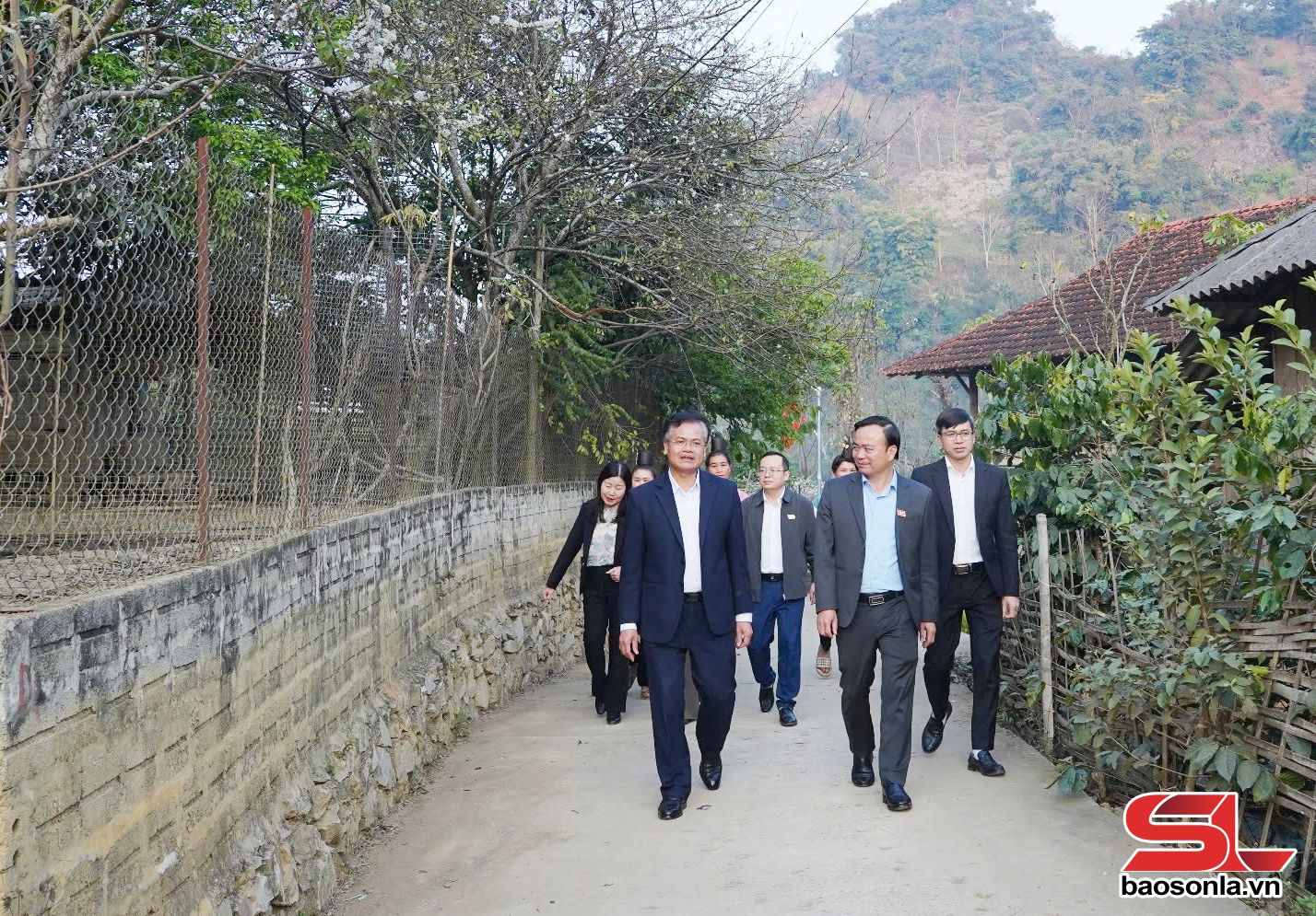 Các đồng chí lãnh đạo tỉnh và phường Chiềng Cơi tham quan các tuyến đường tại bản Ót Luông, phường Chiềng Cơi.