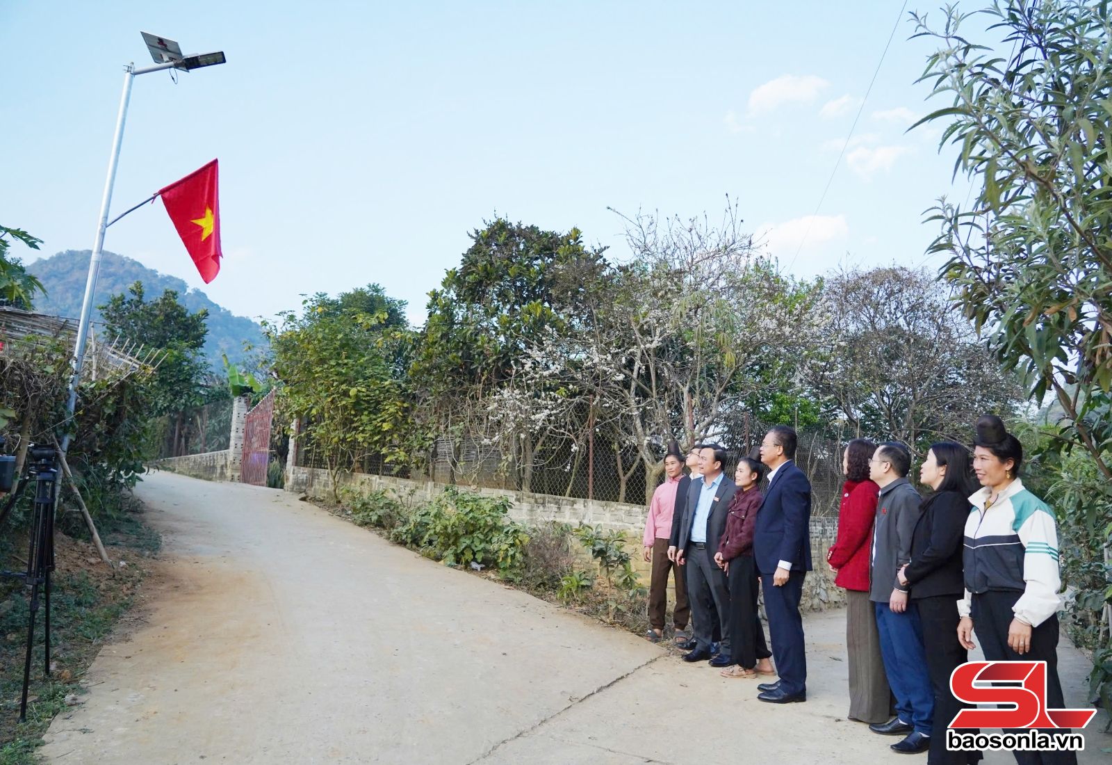 Các đại biểu tham quan tuyến đường chiếu sáng tại bản Ót Luông, phường Chiềng Cơi.