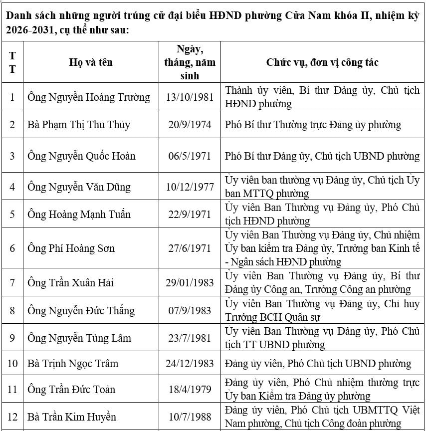 Theo thẩm quyền quy định của pháp luật, Ủy ban Bầu cử phường Cửa Nam công bố kết quả bầu cử và danh sách 21 đại biểu HĐND phường khóa II, nhiệm kỳ 2026-2031.