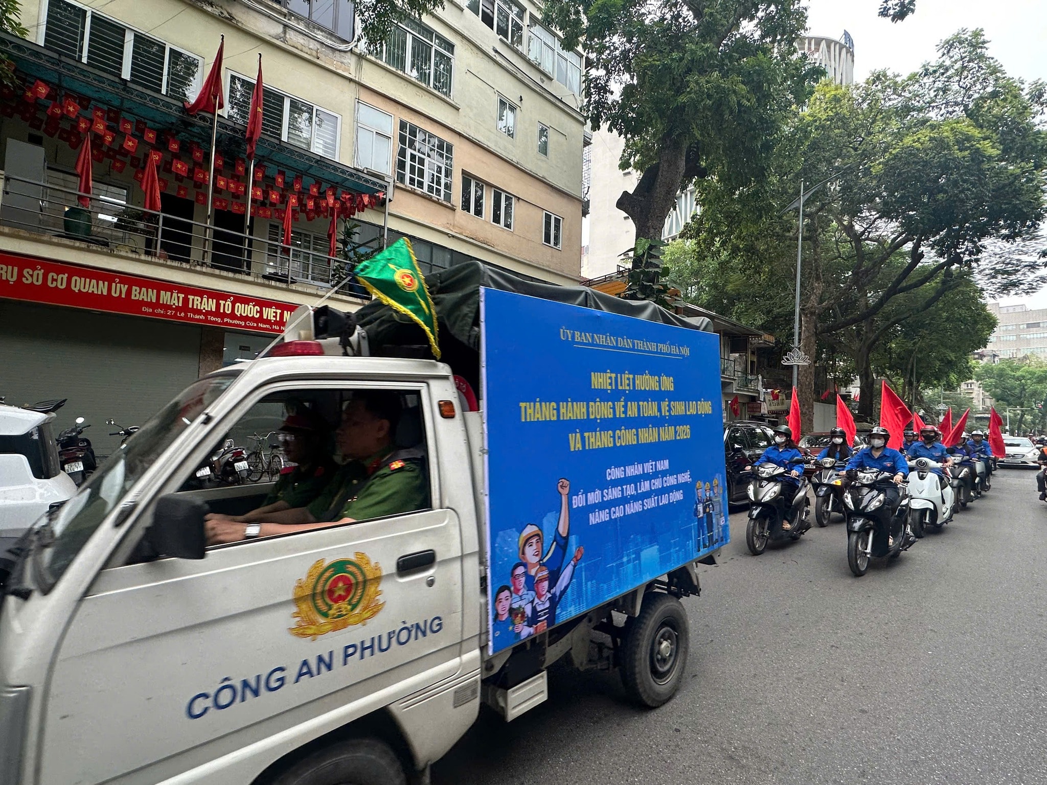 Đoàn xe tuyên truyên lưu động hưởng ứng Tháng hành động về an toàn, vệ sinh lao động và Tháng Công nhân năm 2026 của phường Cửa Nam. Ảnh: PV
