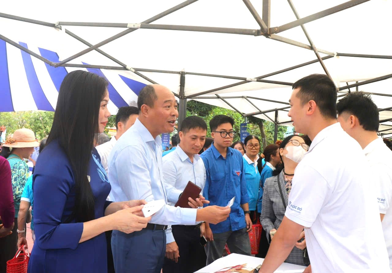 Lãnh đạo phường Định Công tham quan các gian hàng thanh toán không dùng tiền mặt. Ảnh: Phong Thu