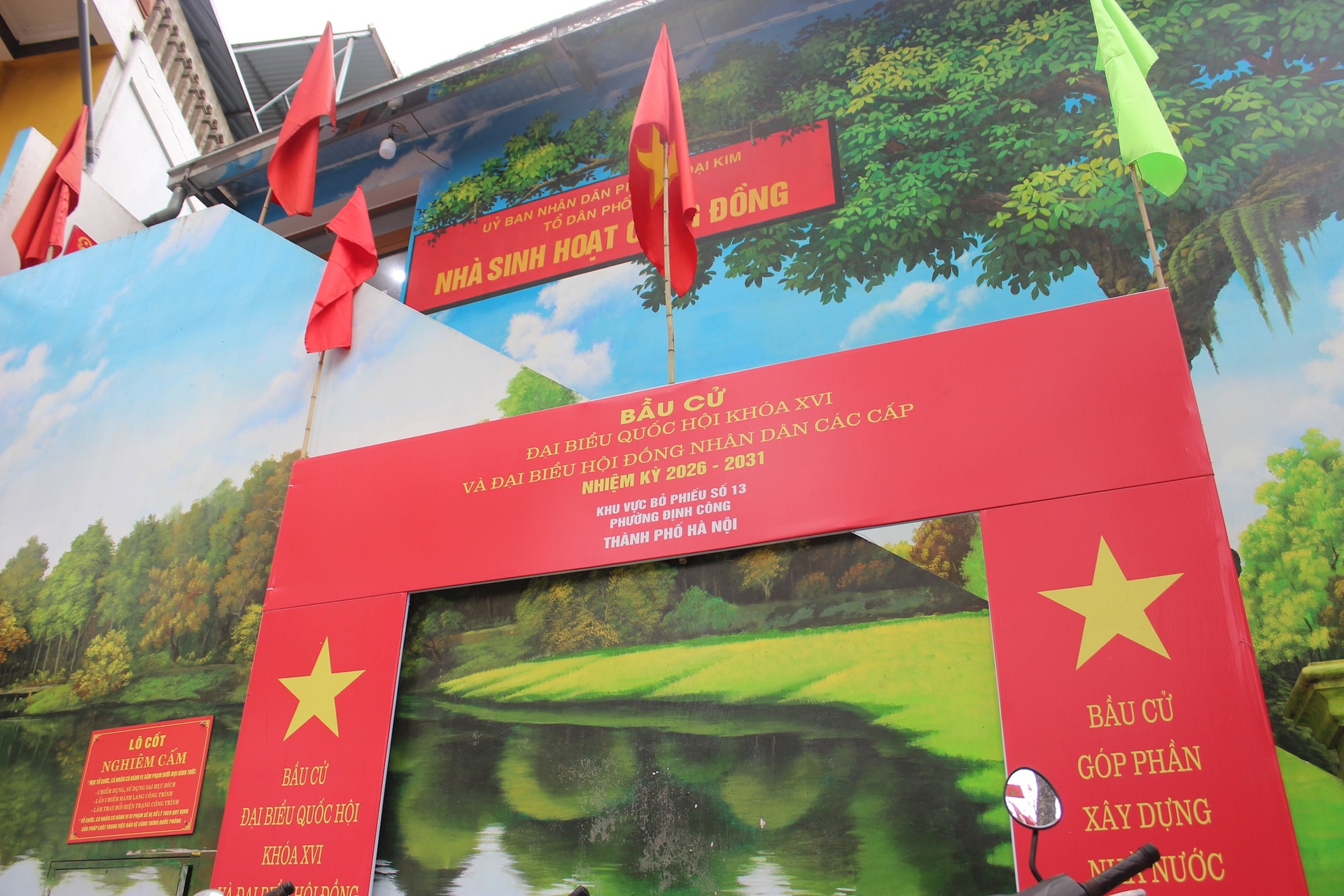 Nhiều điểm bỏ phiếu, cờ Tổ quốc, băng rôn, khẩu hiệu được trang hoàng rực rỡ.