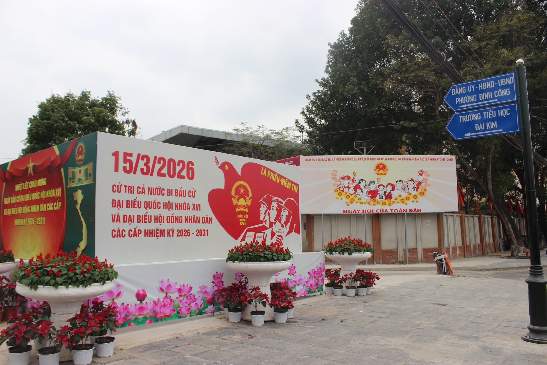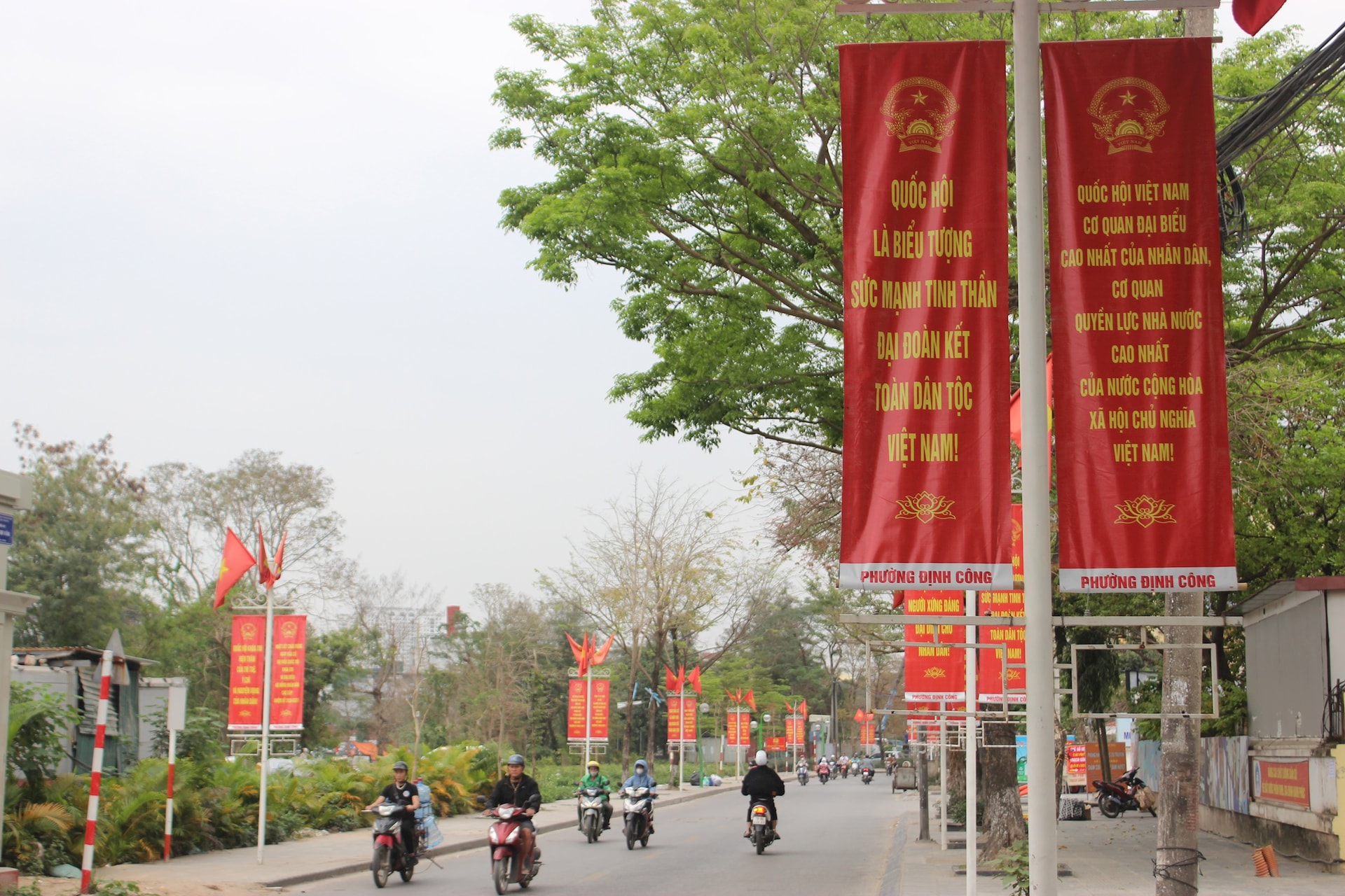 Sắc đỏ của cờ Tổ quốc và băng rôn tuyên truyền được treo rực rỡ dọc các tuyến đường trung tâm phường Định Công, tạo nên không khí trang trọng trước ngày hội bầu cử.