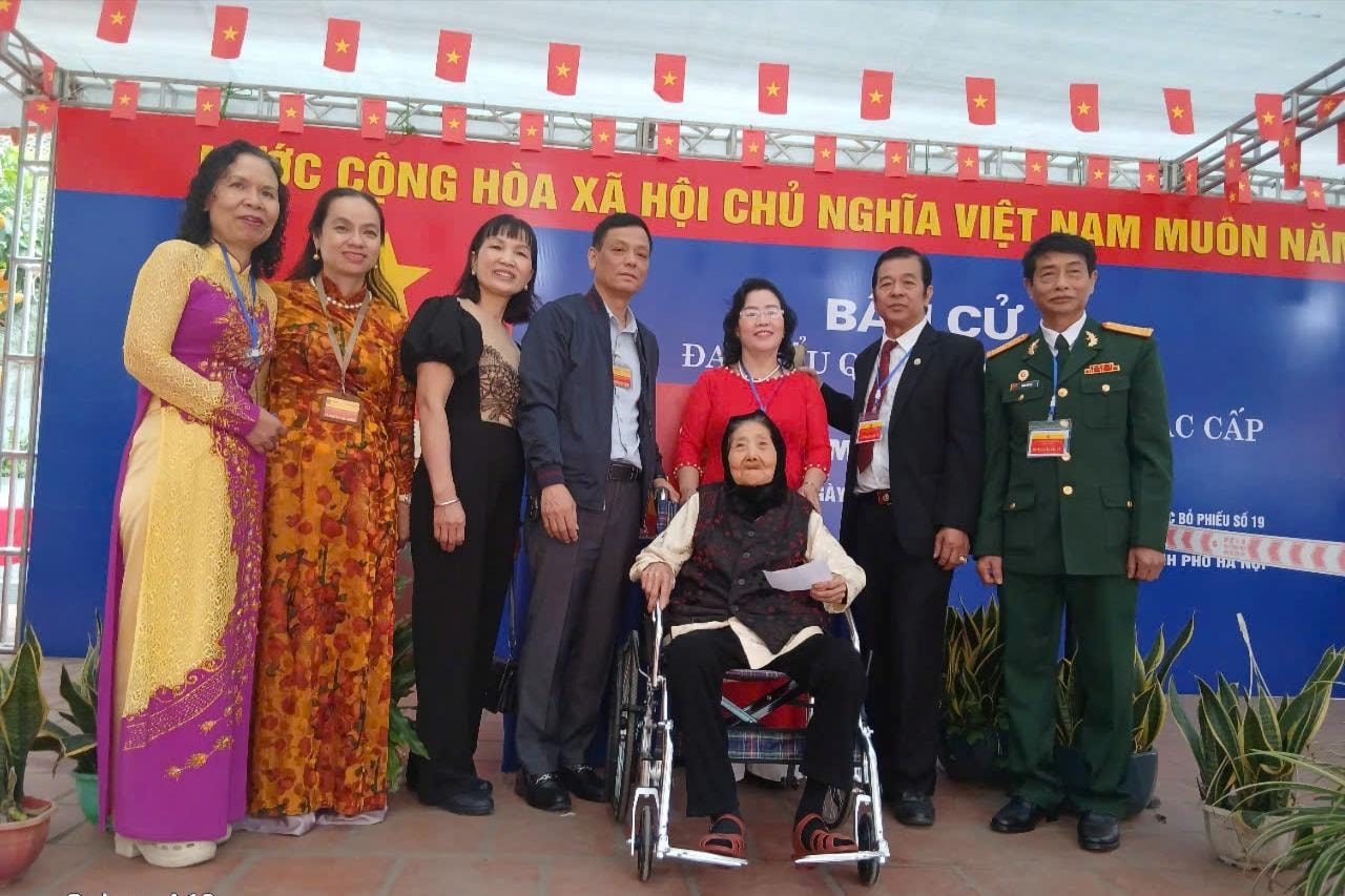 Cụ Trịnh Thị Bê, 101 tuổi trực tiếp đến bỏ phiếu ở khu vực bỏ phiếu số 19, đơn vị bầu cử số 5 trong vòng tay ấm áp của gia đình và những người làm công tác bầu cử. Ảnh: PV