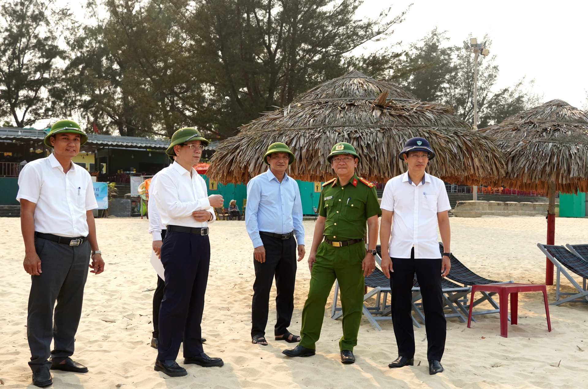 Đồng chí Phan Mạnh Hùng, Bí thư Đảng ủy phường Đồng Hới kiểm tra công tác chỉnh trang, tạo điểm nhấn tại bãi tắm Nhật Lệ - Ảnh: H.Tr