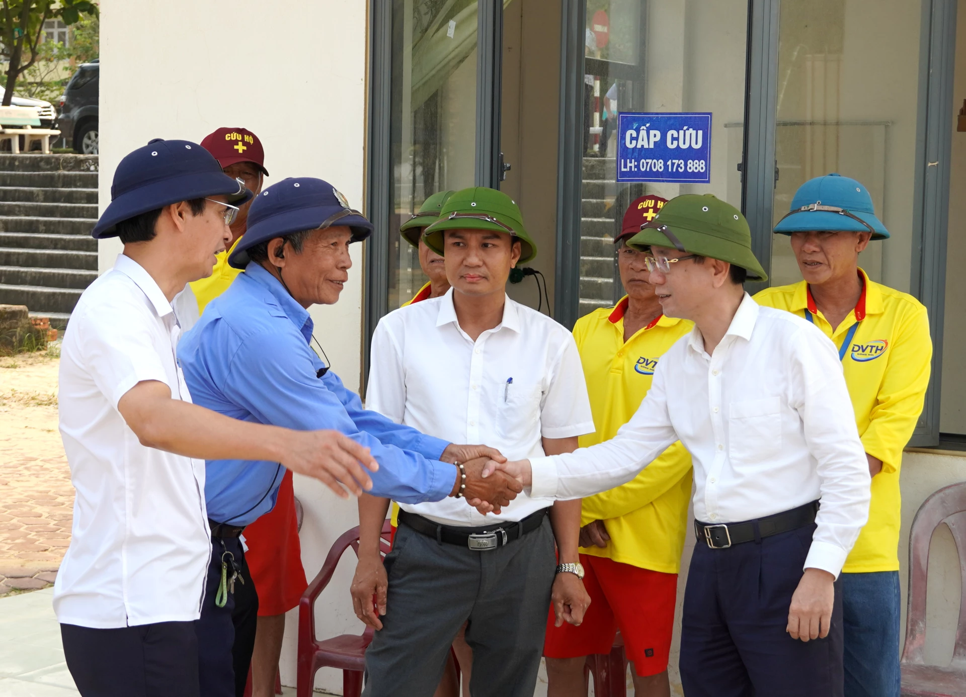 Đồng chí Phan Mạnh Hùng, Bí thư Đảng ủy phường Đồng Hới chia sẻ, động viên các thành viên Đội cứu hộ tại bãi biển Nhật Lệ - Ảnh: H.Tr