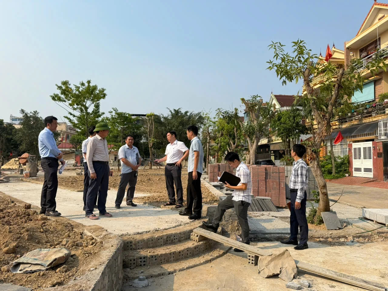 Lãnh đạo phường Đồng Hới kiểm tra tiến độ thi công công viên đường Đại Phong - Ảnh: H.Tr