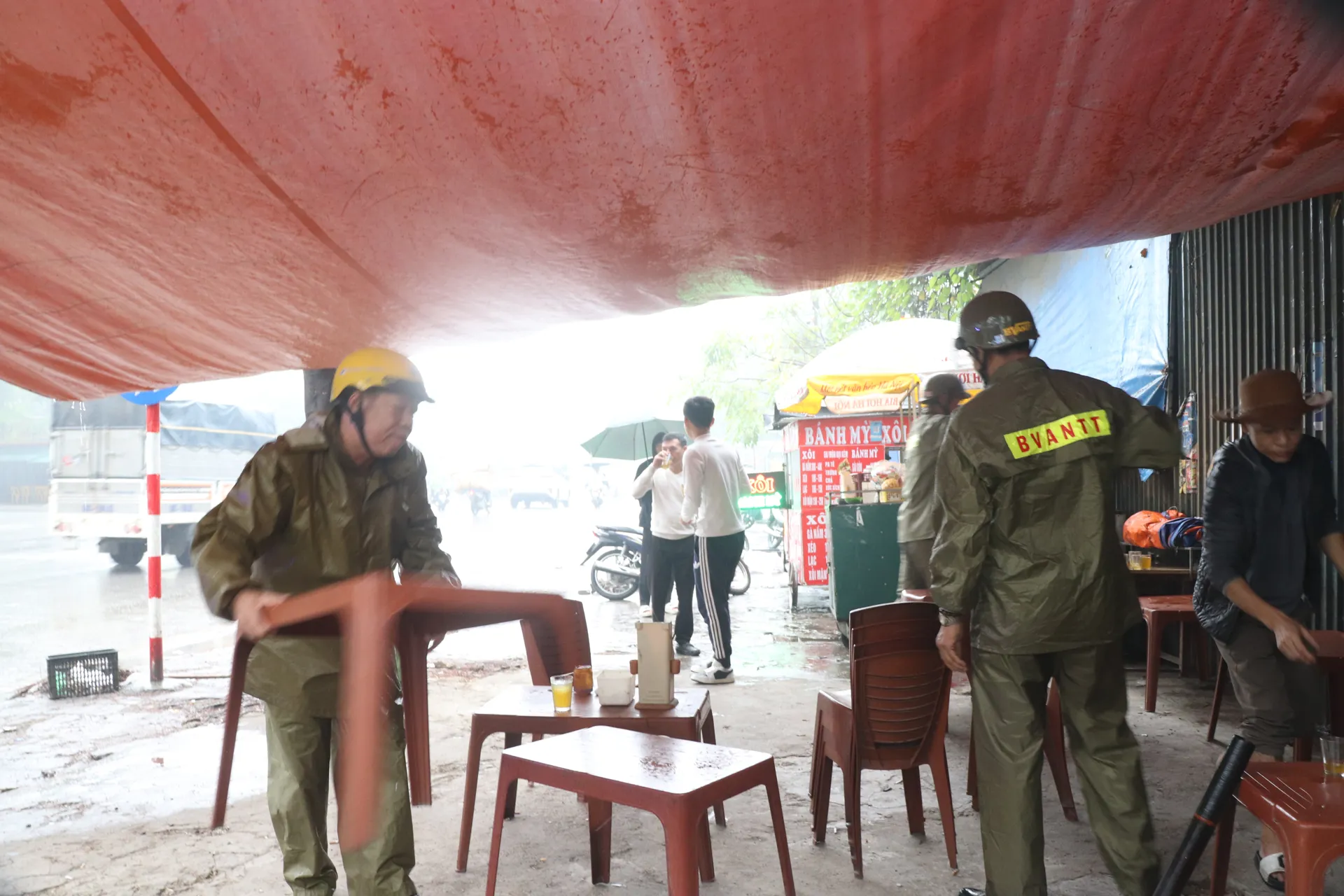 Lực lượng chức năng thu dọn bàn ghế tại một quán nước trên phố Viên.