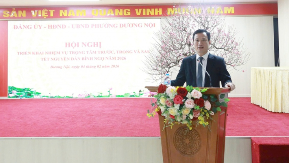 Ông Phùng Chí Tâm Chủ tịch UBND phường Dương Nội phát biểu tại Hội nghị triển khai một số nhiệm vụ trọng tâm trước, trong và sau Tết Nguyên đán Bính Ngọ 2026.