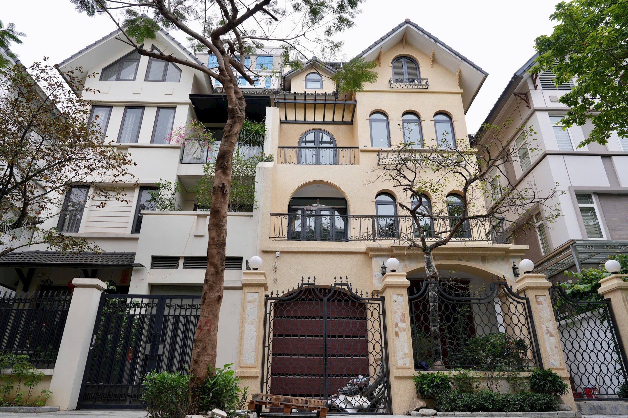 Công trình tại địa chỉ BT L15-03, khu A - Khu đô thị mới Dương Nội (ngôi nhà màu sơn vàng) đã xây dựng nhiều hạng mục vi phạm trật tự đô thị của khu đô thị. Ảnh: Linh Anh